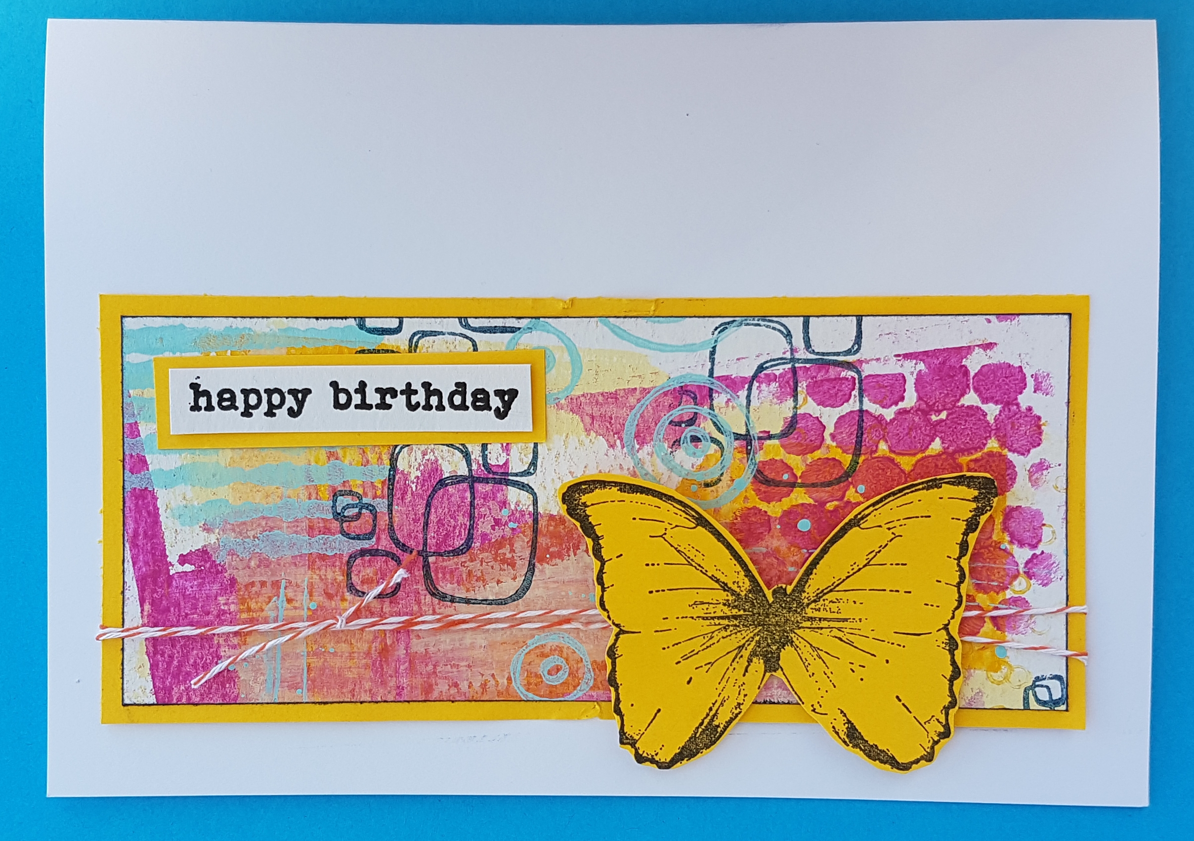 Card two uses the finnabair stamp to add the feature stamped onto the same yellow cardstock as the mount to the panel and sentiment.