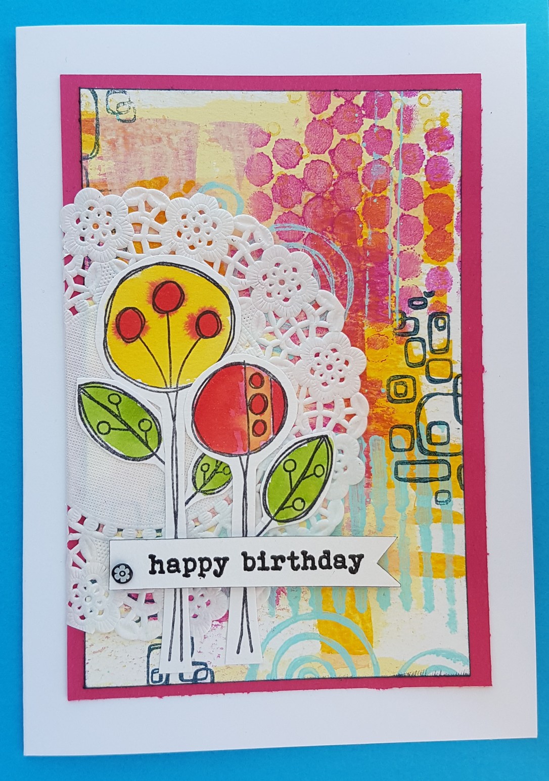Card one I used Kim Dellow stamps to create the flowers and added a doily to separate the bright blooms from the background. In all except one card the feature image is watercoloured using SU inks and a waterbrush.