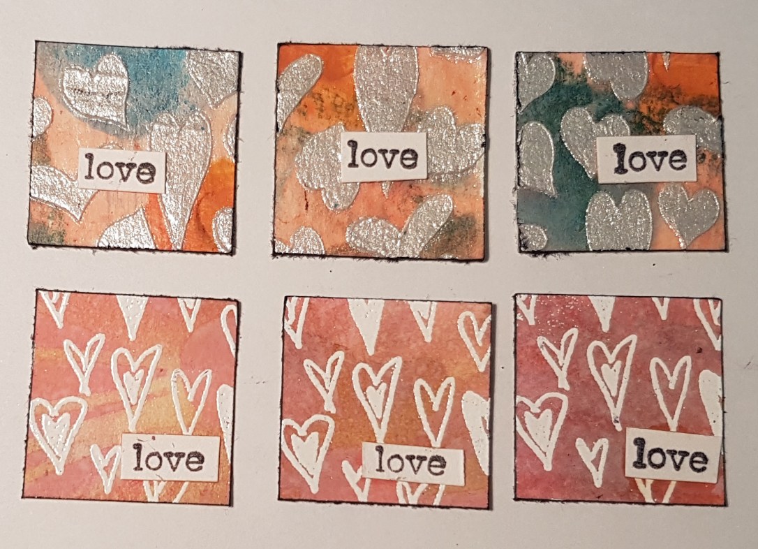 The top three are a painty grungy background with iridescent medium masked hearts.
