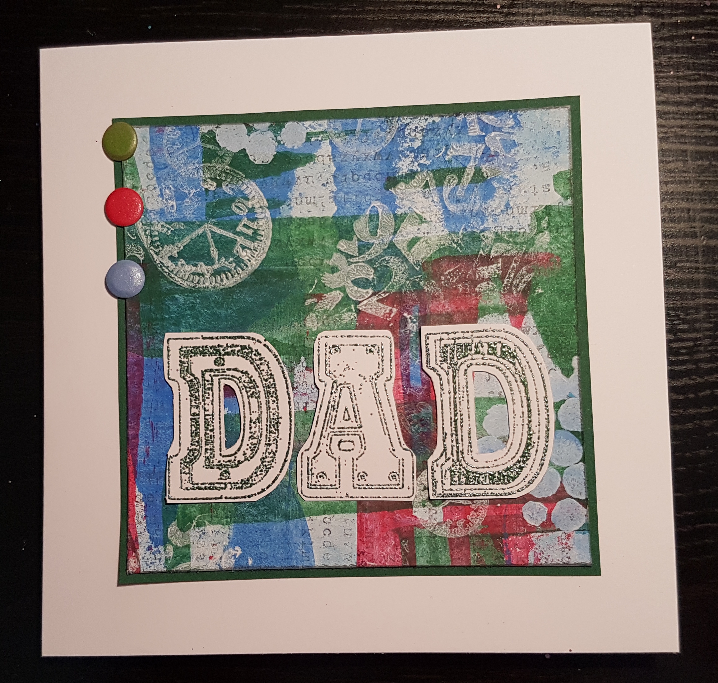 It was quite a simple card to make. I used the painty background I created in a session with friends last month and then added the Dad stamped letters (DoCrafts/papermania) which I heat embossed and cut out.