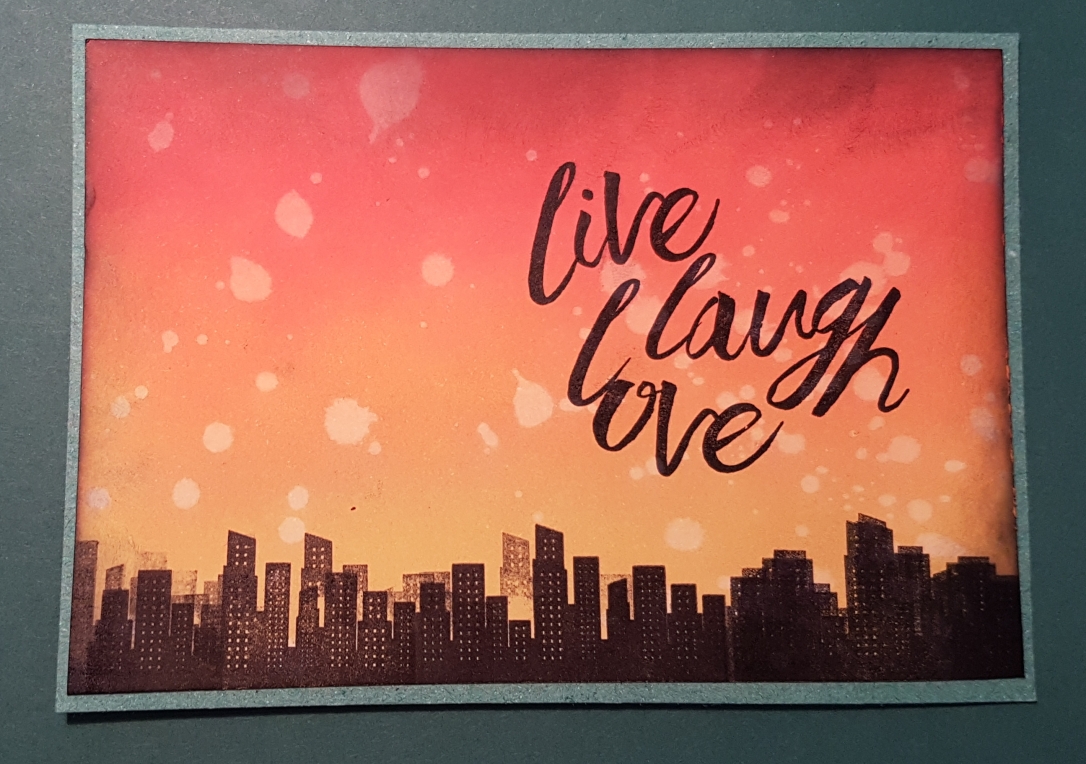 I knew I wanted to use the city scene stamps I had so created a lovely sunset with Distress Oxides and then did my stamping. I finished it off with the layering the Love quote stamp.