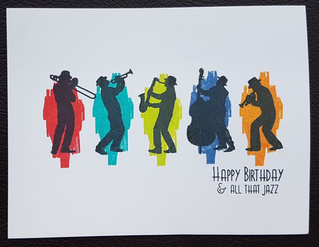 A few days ago I shared some Inchies that I had made which gave me an idea for a card using the silhouette jazz musicians and the Happy Celebrations stamps.