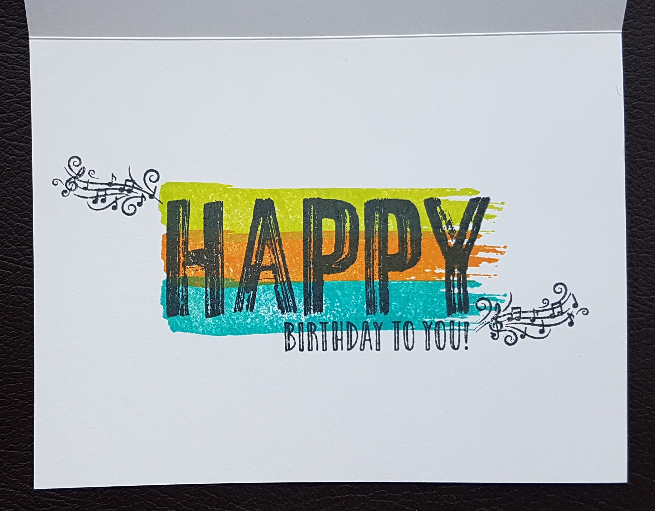 I chose the long brush stroke stamp and stamped it three times in different colours and then overstamped using the Happy in Black soot and then added some little musical elements to keep with the theme on the front.