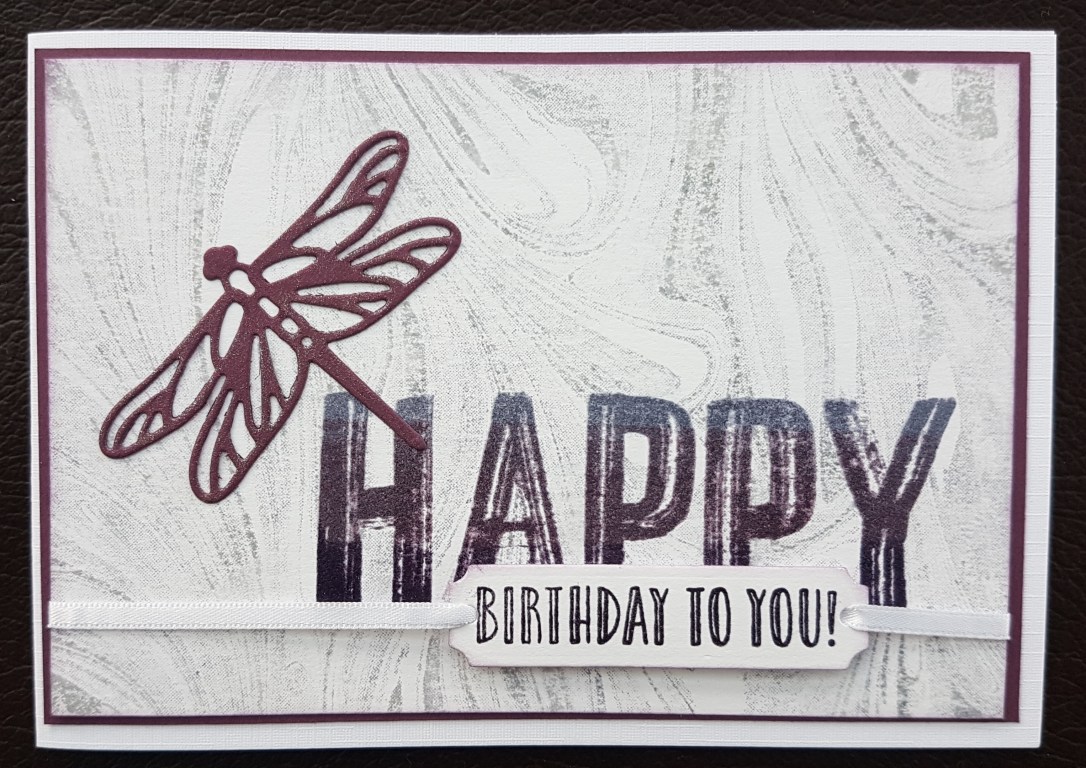 Loving the marbled background (so elegant) and the ombre Happy and then the shimmery die cut dragonfly.  Such fun!