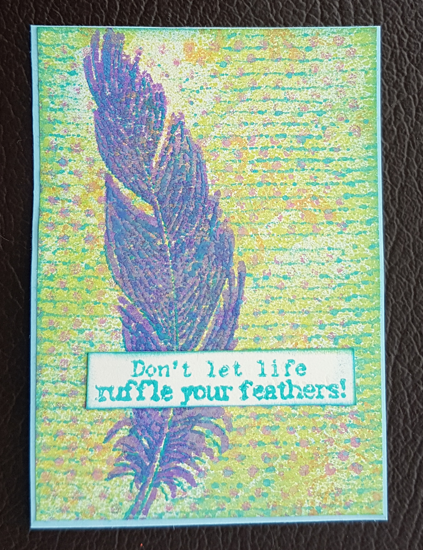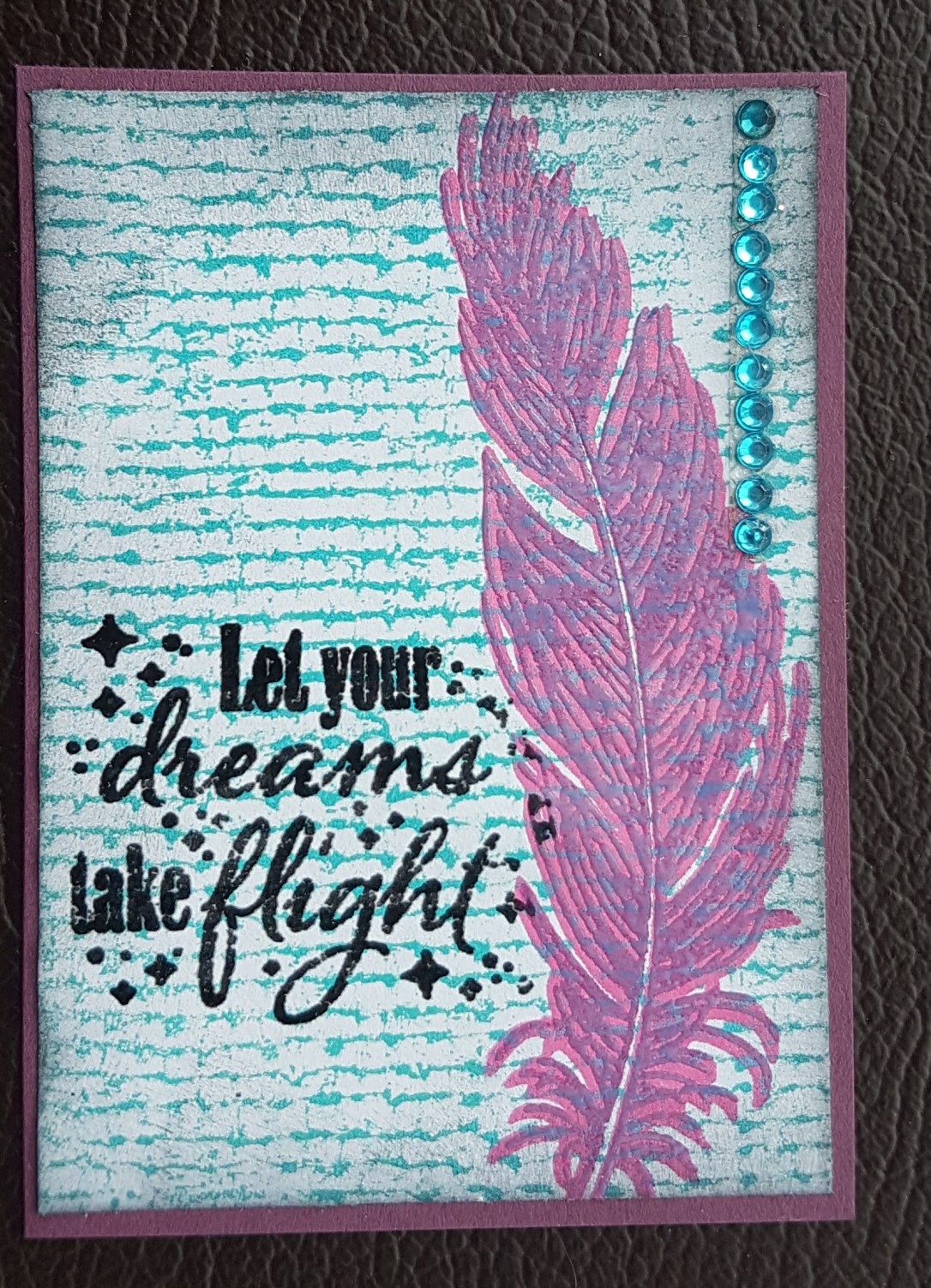 The feather stamp and sentiment came with a magazine. It’s a two step stamp and I stamped the base and the top in different colours of distress oxide and then added clear emboss to the top layer. I had made sure I dried it in between to only add the embossing on the top layer as the distress oxide can stay wet a while. I then heat embossed the sentiment in Black to make sure it stood out.