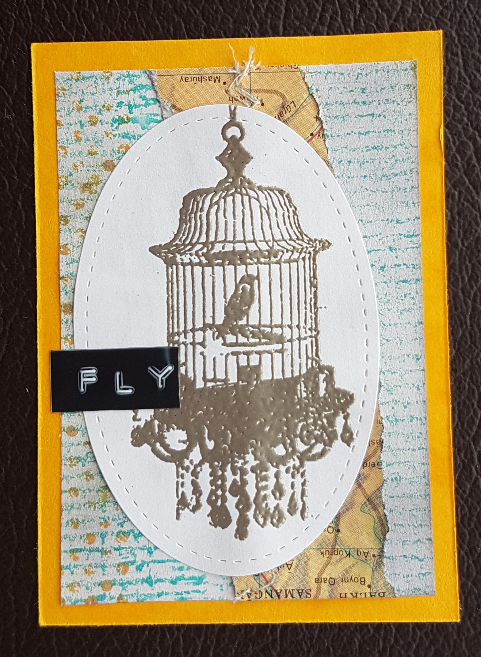 Same approach as the one above but this time a die cut and some heat embossing of the gorgeous birdcage image. Then I added the label word to add a graphic element.