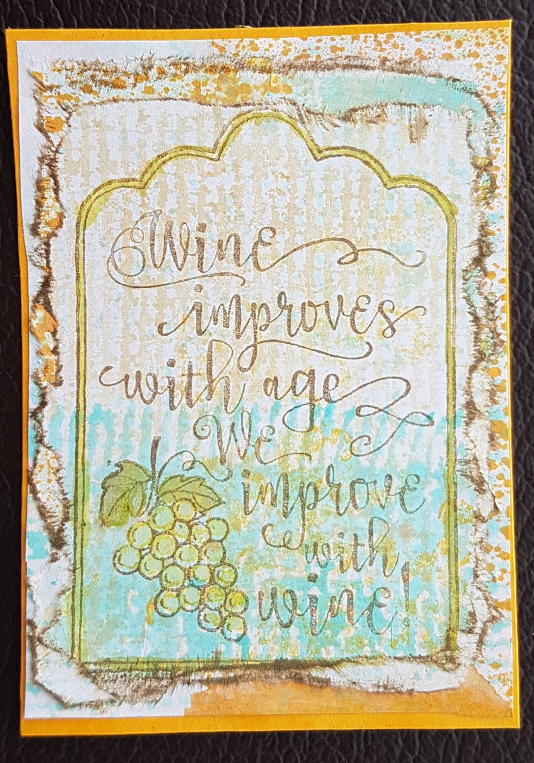 This time I took several pieces of the leftover scrap paper, tore them, inked the edges and layered them up. The top piece j added the stamped image from half full stamp set and added a little bit of colour to the grapes and outside edge to add definition. Love how all the layers coordinate and yet provide distinct layers.