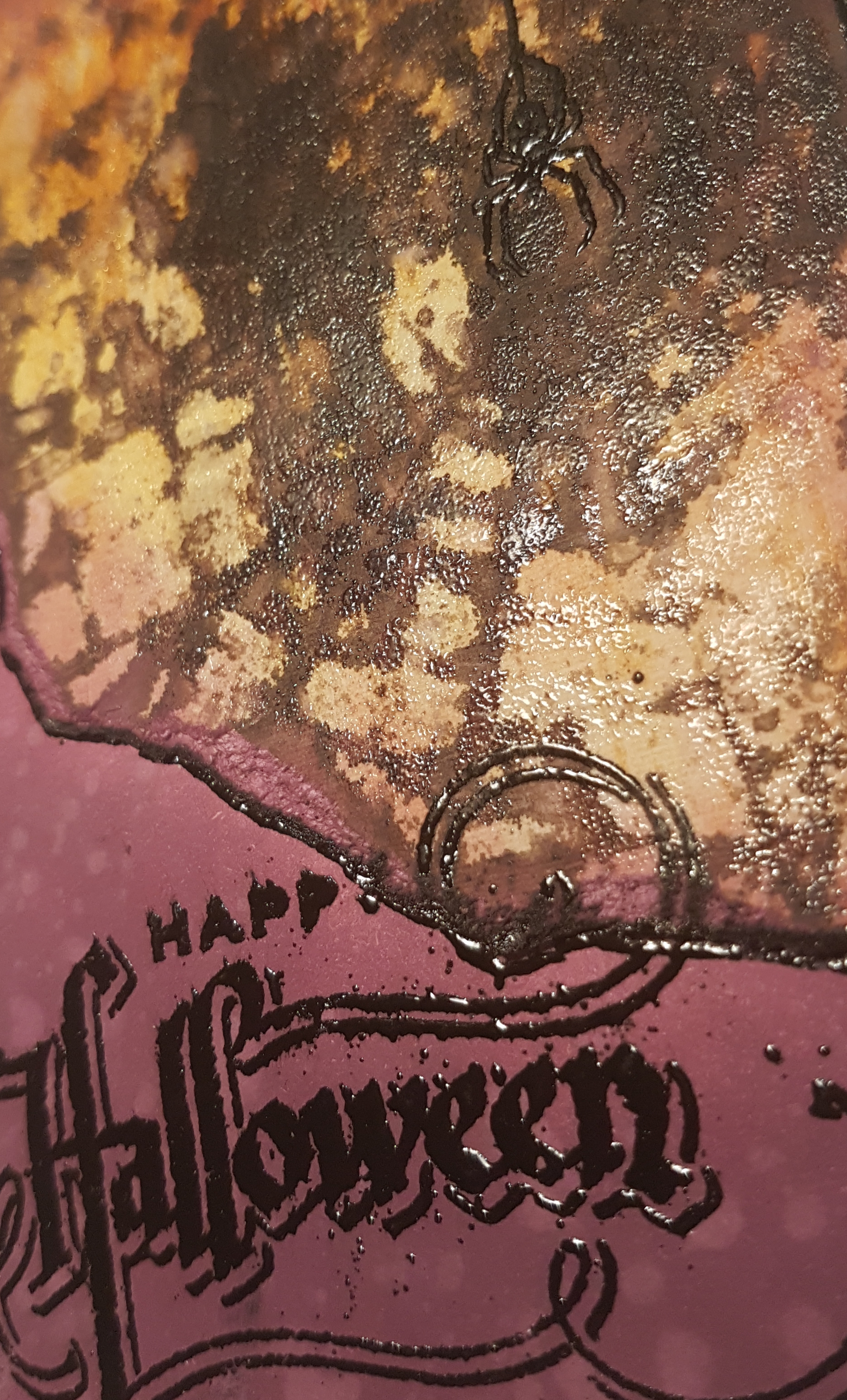 Then I started heat embossing… first the sentiment and spider in Black powder. Then I added the outline to the torn piece using the embossing pen and black powder. Then I added the stenxil back over the top and pressed versamark through and clear embossed… this provided some fab texture. I think you can see it best on this closeup.