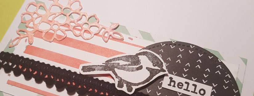 The first one had four different patterns on it and a fun bit of black trim along with a diecut flower from the Petals and more set and a bird from the Petal Palette set. Cute!