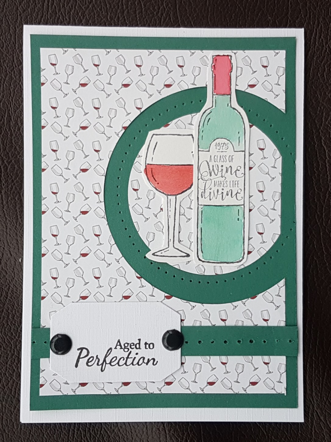 The second card I used Tranquil Tide cardstock which I thought worked well with the green bottle. I added some piercing to embellish and this time black brads to add the sentiment tag. This time I used ink to water colour the images.