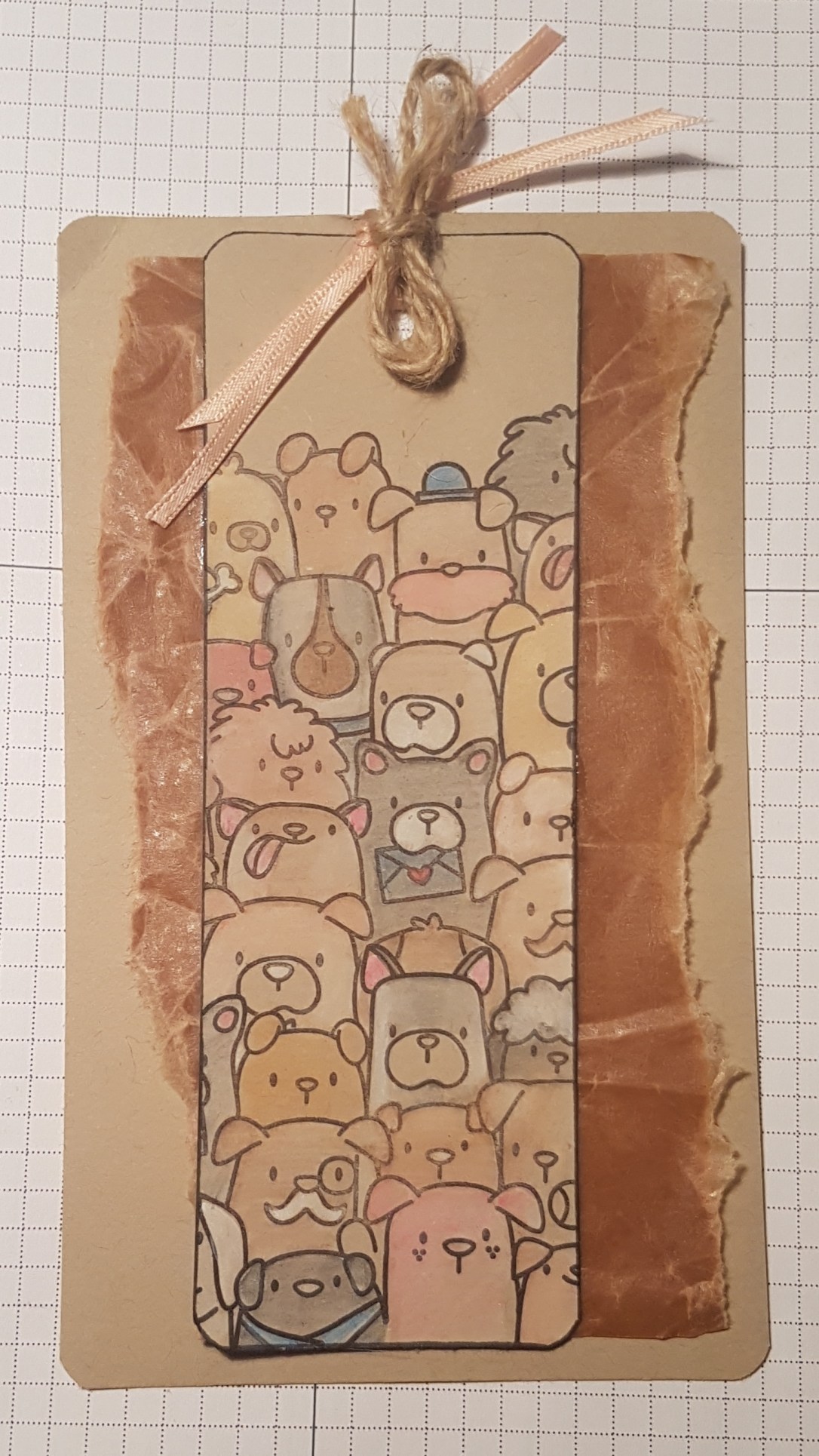 Once they were all coloured as I wanted them I edged the panel and then layered it onto another piece of kraft with a layer of waxy paper in between. I then punched a hole and added the string and ribbon.
