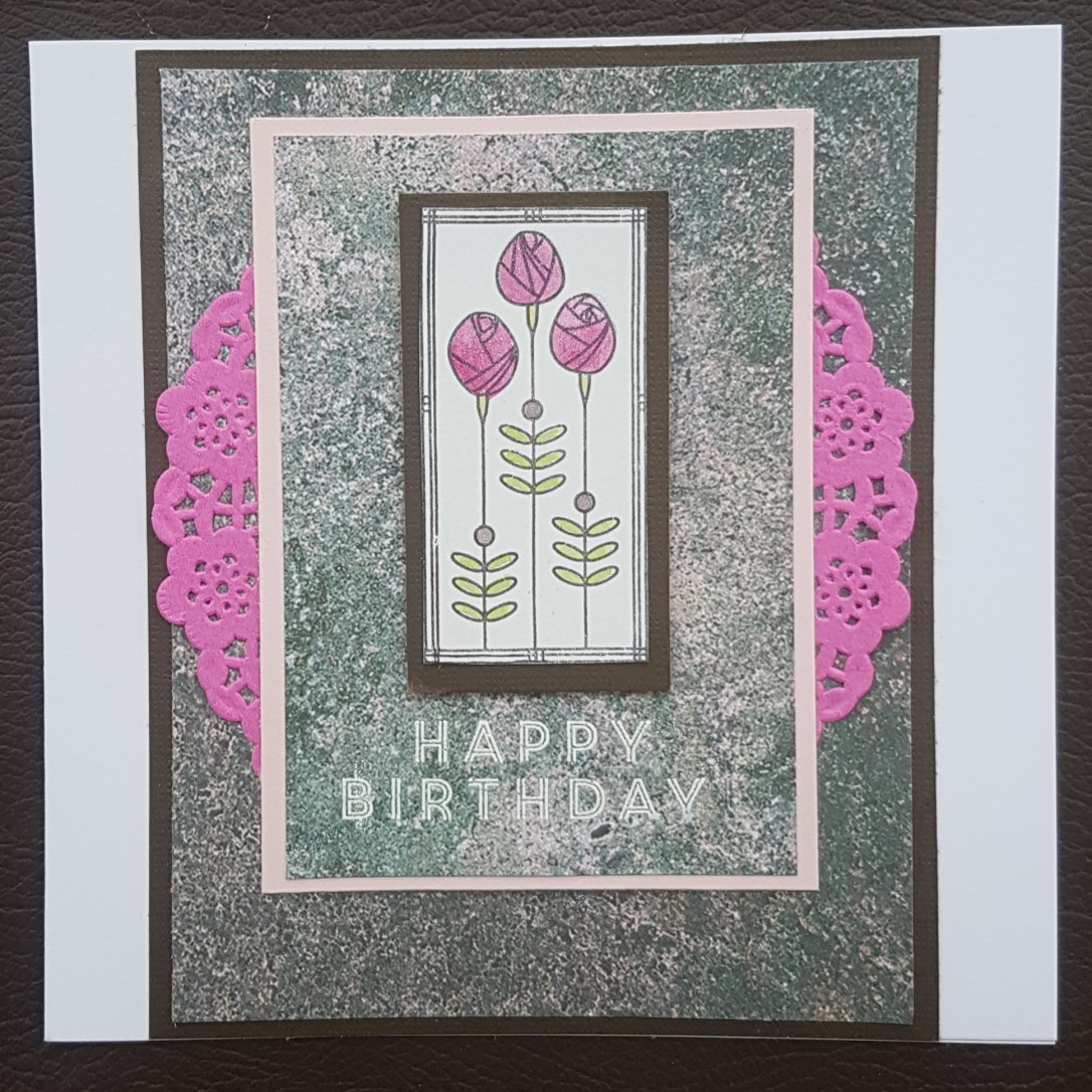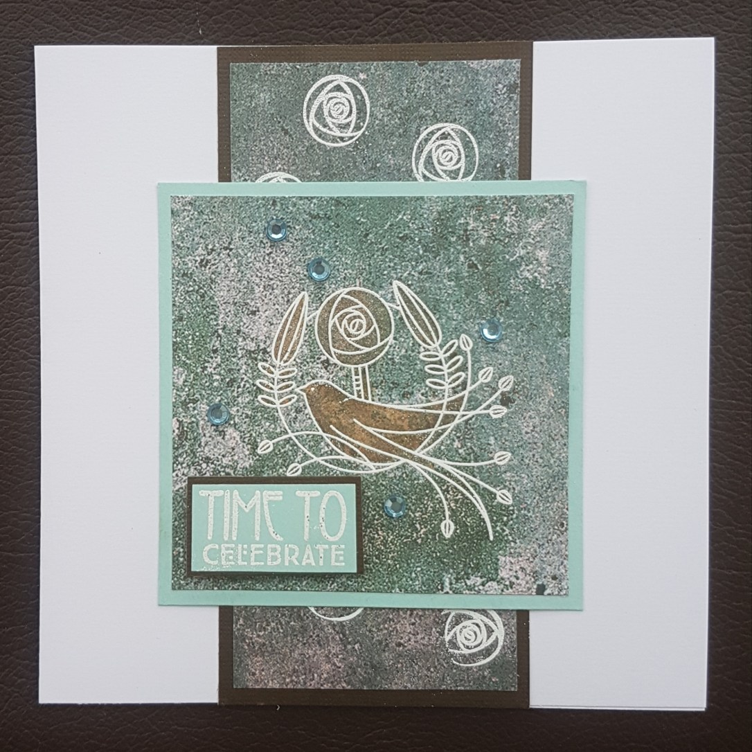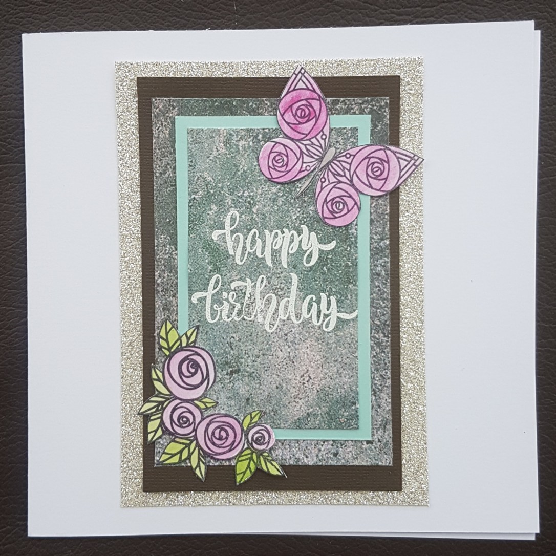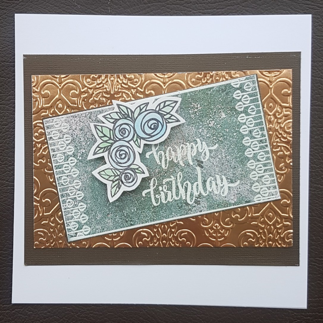 Heat embossed the main image onto the paper and also the same with the single rose image onto the back panel. Then added colour with the distress oxides to give more definition to the bird. Also stamped and embossed the sentiment and mounted that onto the brown card too. I love this bird image so much.