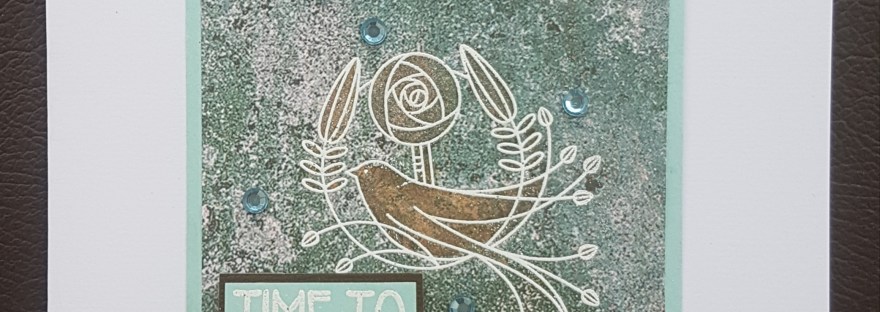 Heat embossed the main image onto the paper and also the same with the single rose image onto the back panel. Then added colour with the distress oxides to give more definition to the bird. Also stamped and embossed the sentiment and mounted that onto the brown card too. I love this bird image so much.