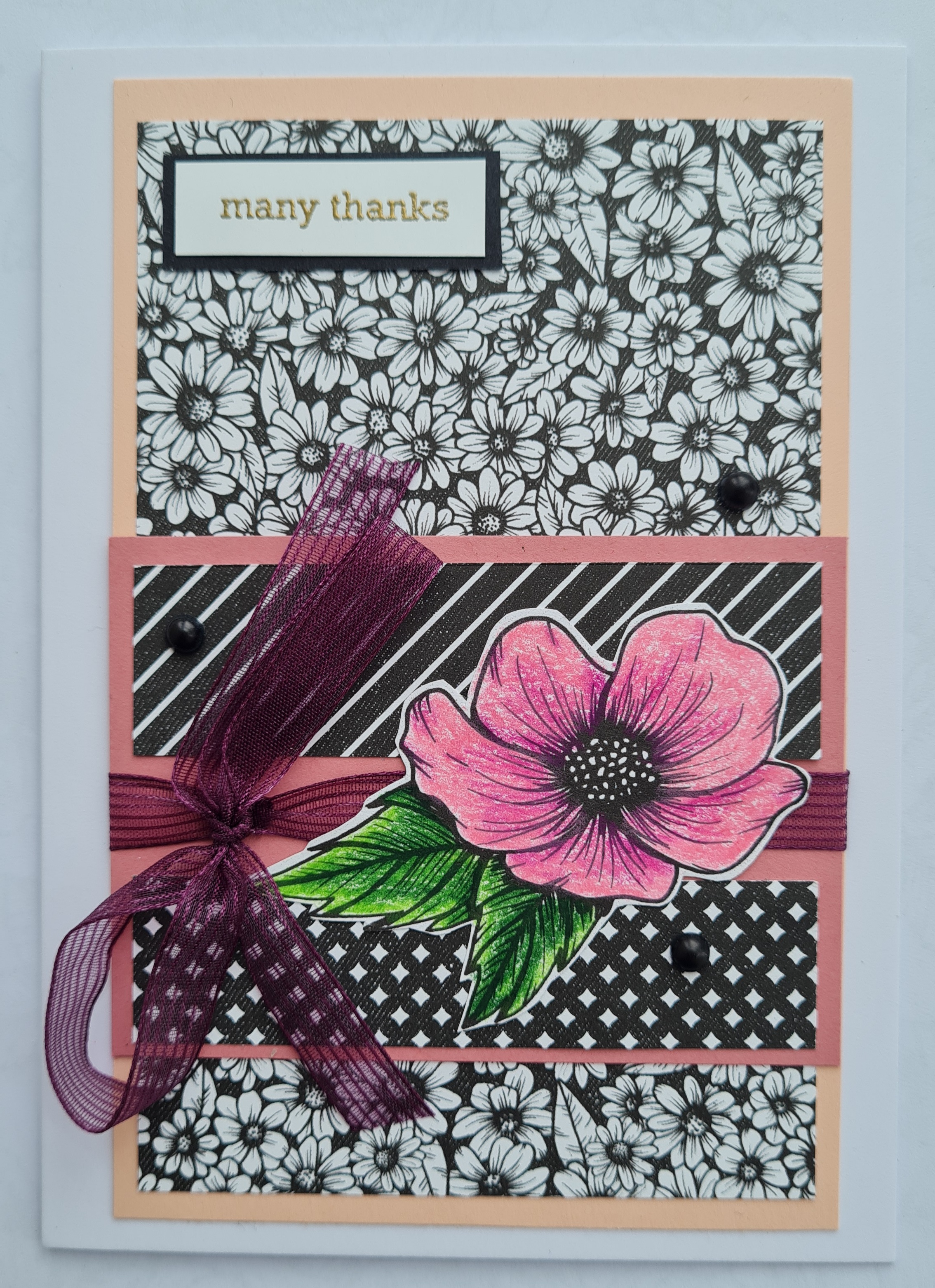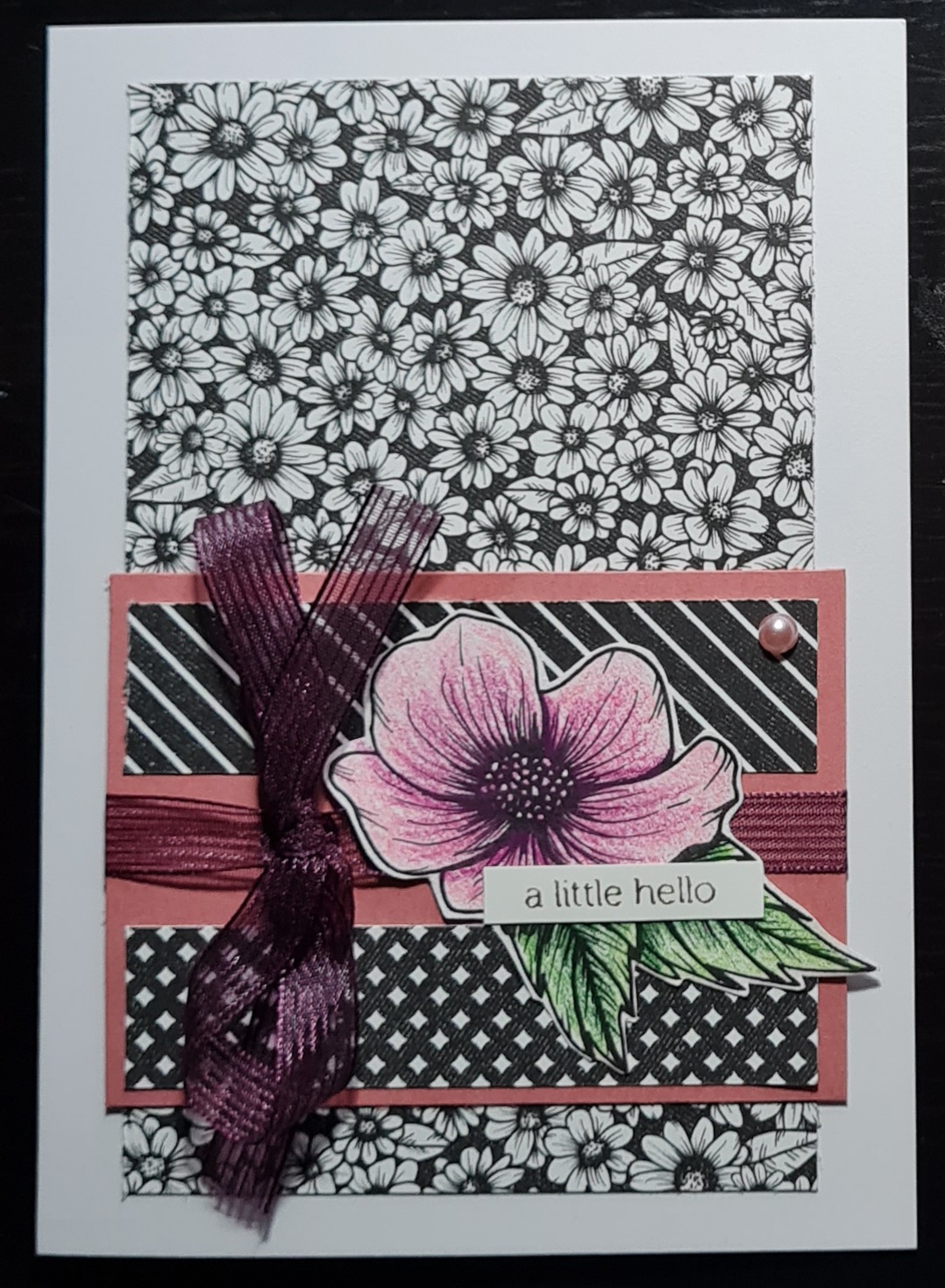 Next card is a very busy daisy like background with little strips of the reverse patterns. This time I chose prismacolour pencils to colour in the image. I added the Blackberry Bliss ribbon and a nice bow to finish this one off. The colours on the pic have come out a little strange as the flower is less neon in real life but even so I love this card with the contrasts.