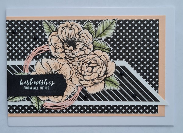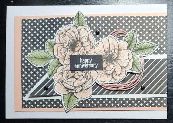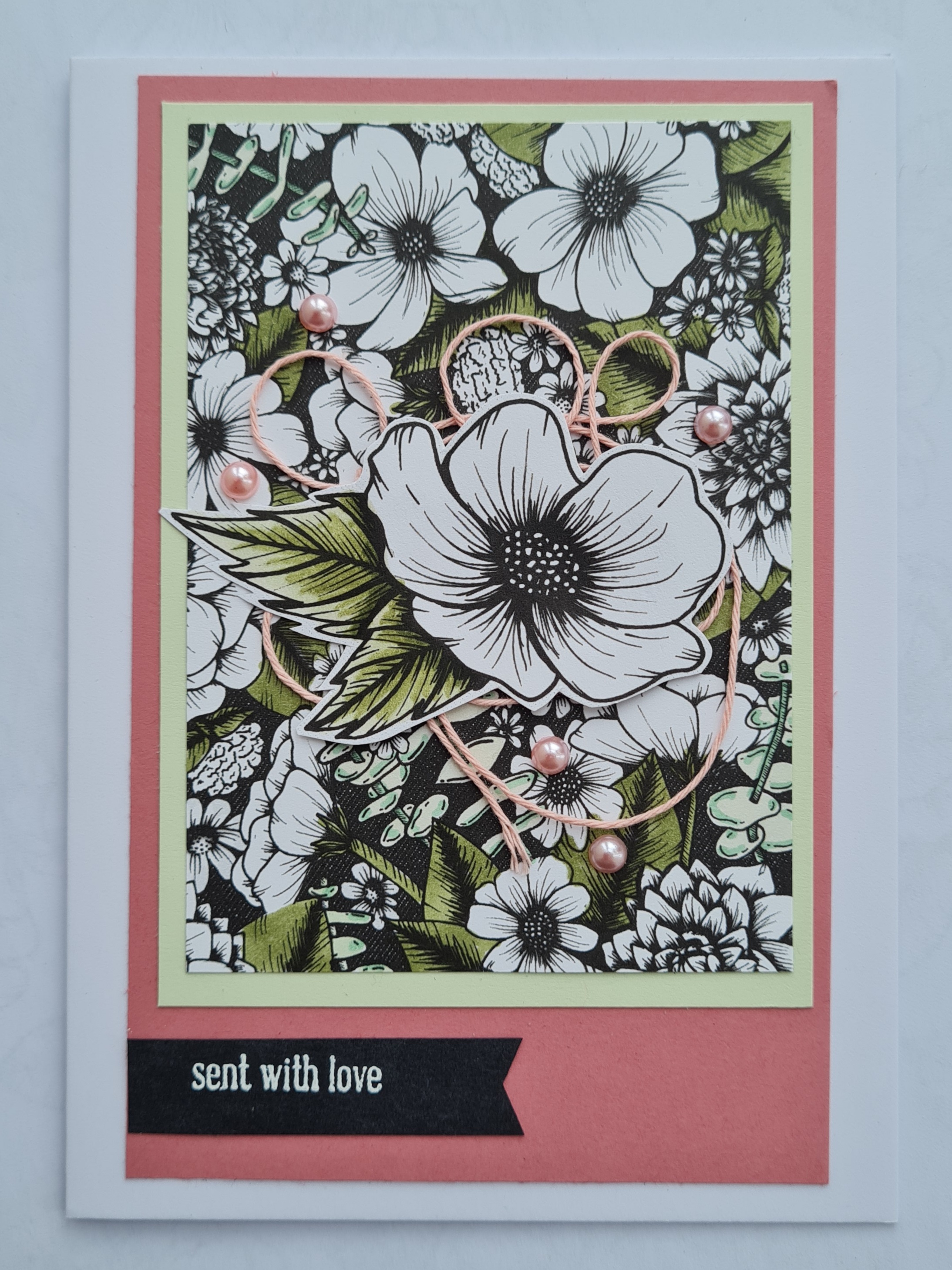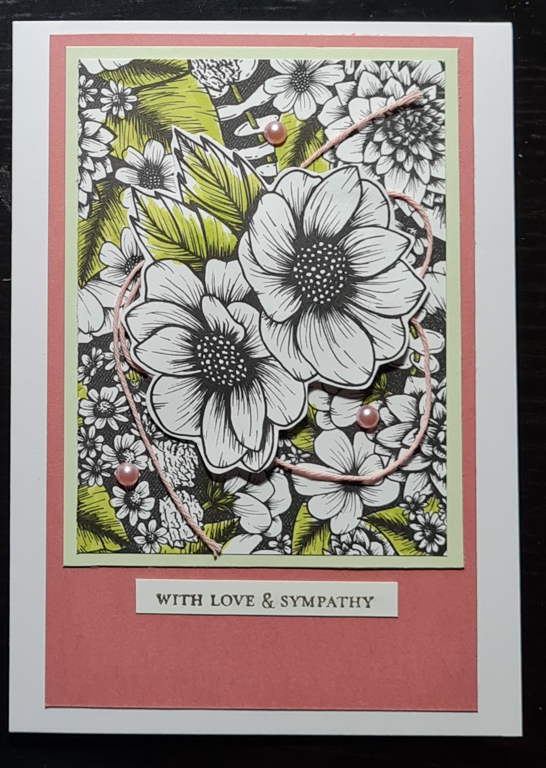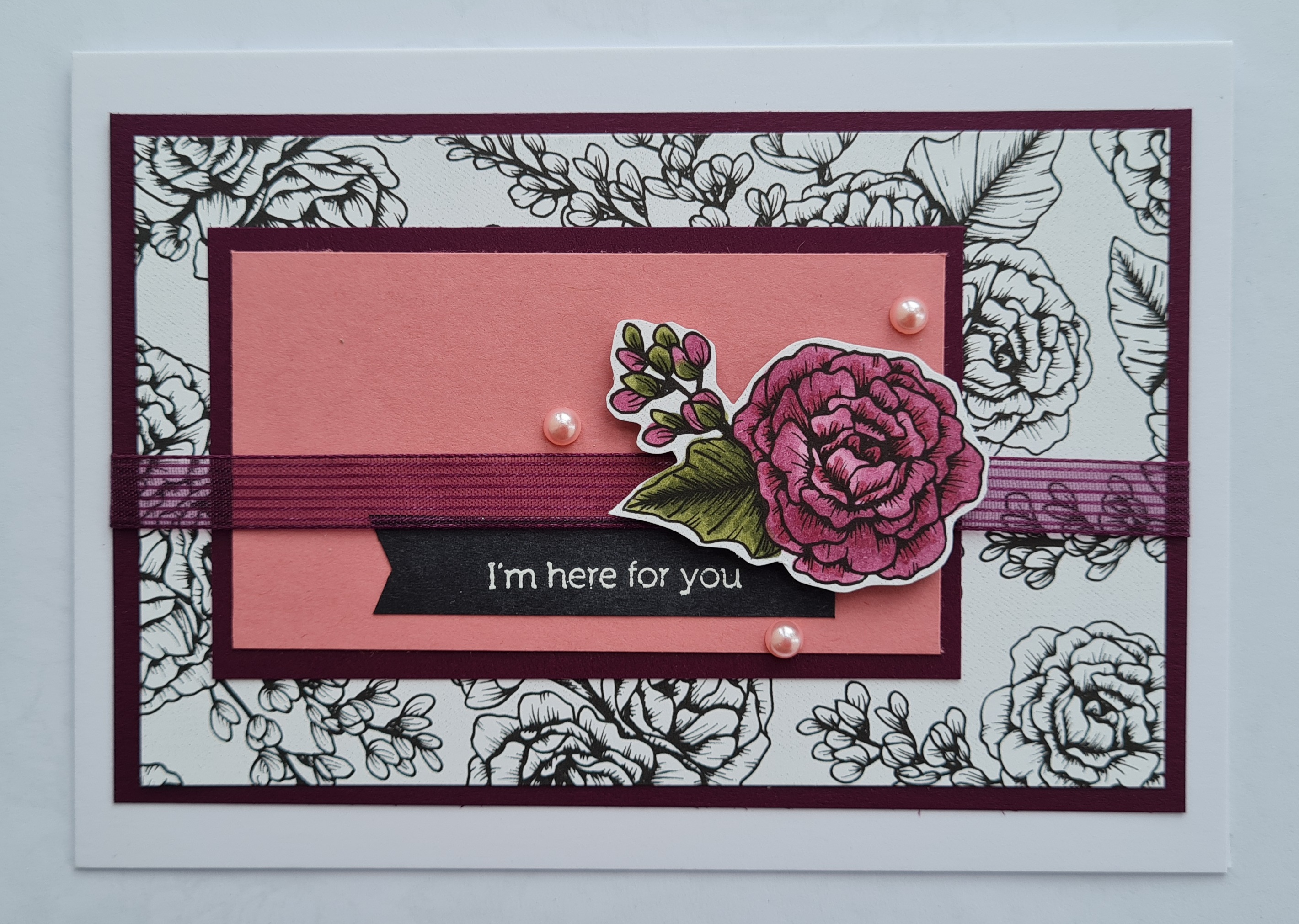 I then chose the same paper as a panel but gave it a hand drawn border with with Stampin Blends and panel of soft seam foam for underneath. I laid them wonky and added a twist of the ribbon under the floral focal feature. I added the sentiment right in the middle and embellished with the pearls.