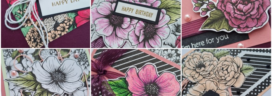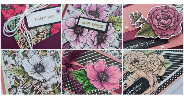 Love this set of floral cards with the dramatic black and white and the beautiful colours of Petal Pink, Rococo Rose, Blackberry Bliss and Soft Sea Foam… a lovely combo.