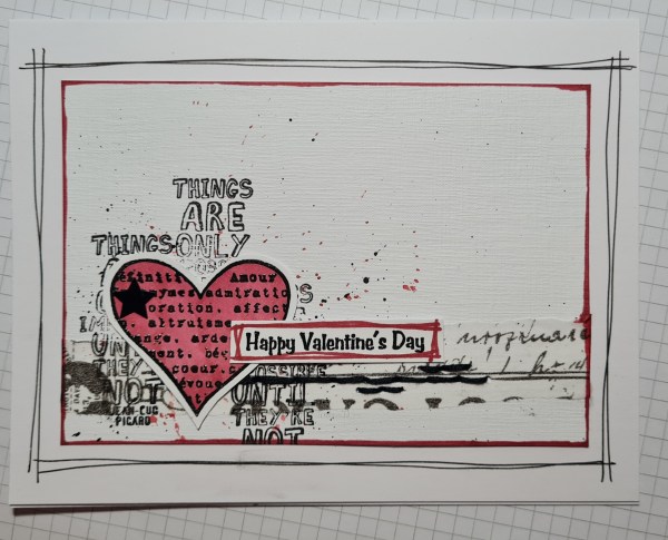 I used a scrap of the Tim Holtz collage tissue paper and then some stamping for my card for the hubby. I added some sewing and some splats of Cherry Cobbler and Black gesso.
