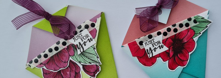 I used the Oh so ombre dsp for the pouch and then added some flowers cut from the True Love dsp which I coloured using the Stampon Blend markers. I then added some dotty washi tape and the little bow of the Blackberry Bliss ribbon. Because the Oh so ombre paper has a different colour on each side it looks so fun with the contrasting colours and the fun flowers.