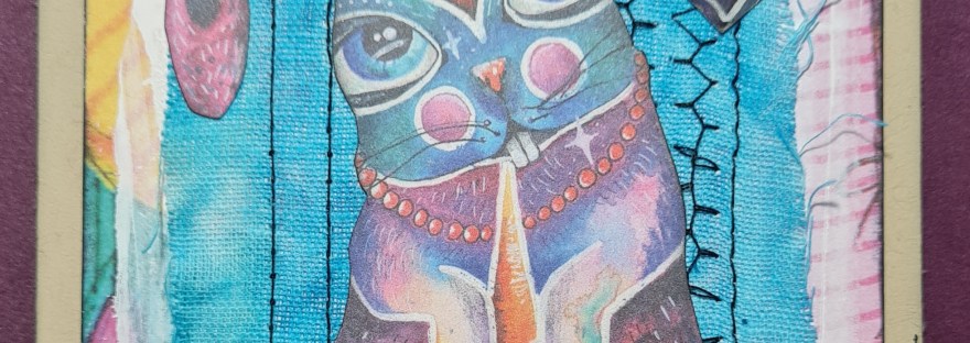 Used Art by Marlene collage papers and die cuts and sewing and Tim Holtz stickers and had lots of fun making it… even if it did give me smurf fingers!
