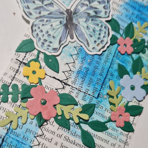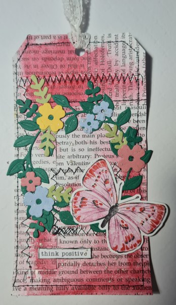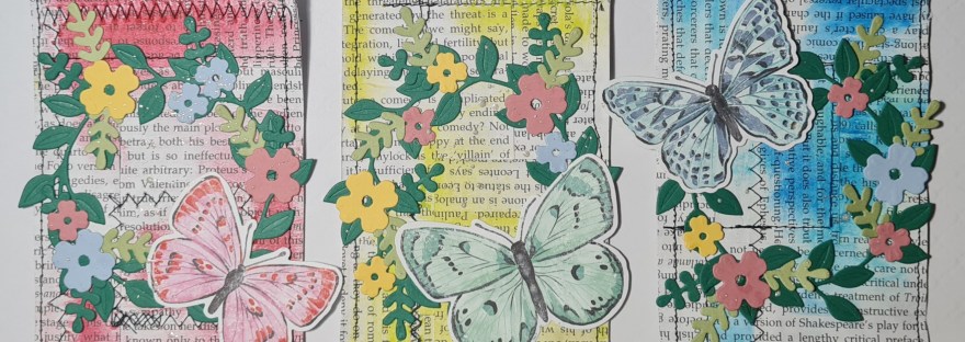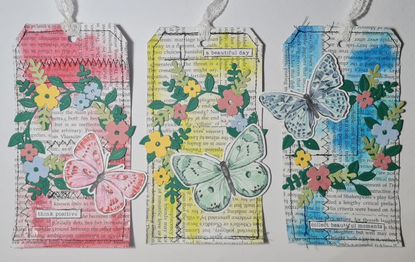 Today I have another Design Team contribution for Happy Little Stampers Anything Goes with Dies challenge. I made three mixed media tags and added the Wreath Builder die cut wreath and flowers and the die cut butterflies.
