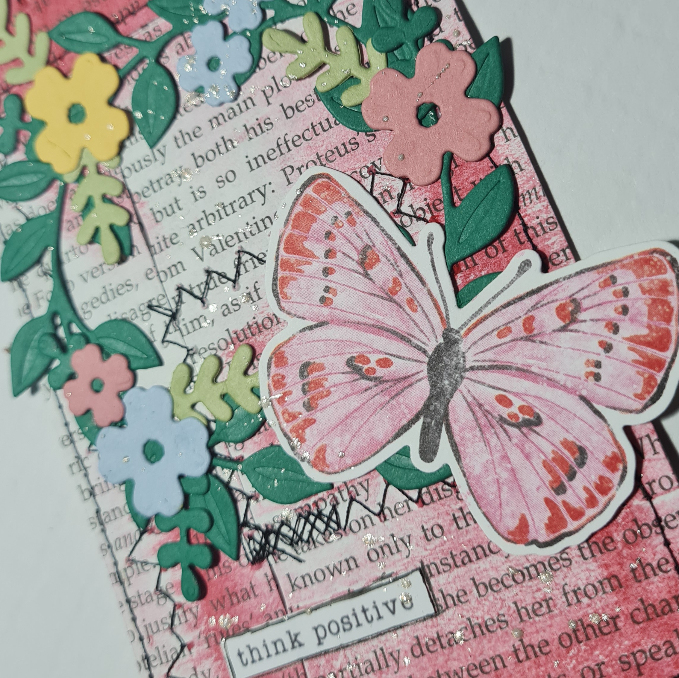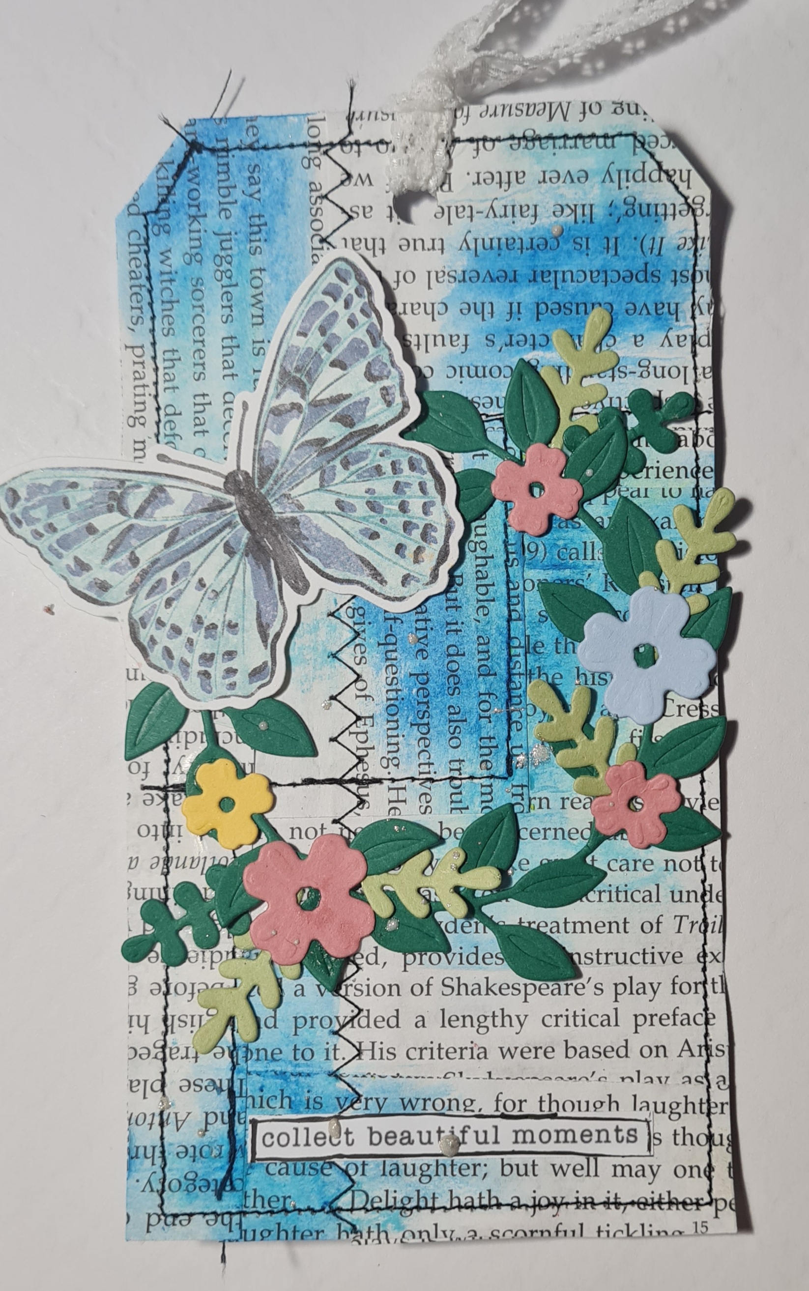 The tags were made from collaged bookpages using a technique I saw from Joie de Fi on YouTube. There was lots of sewing and then after cutting them to size, more seeing round the edges too.