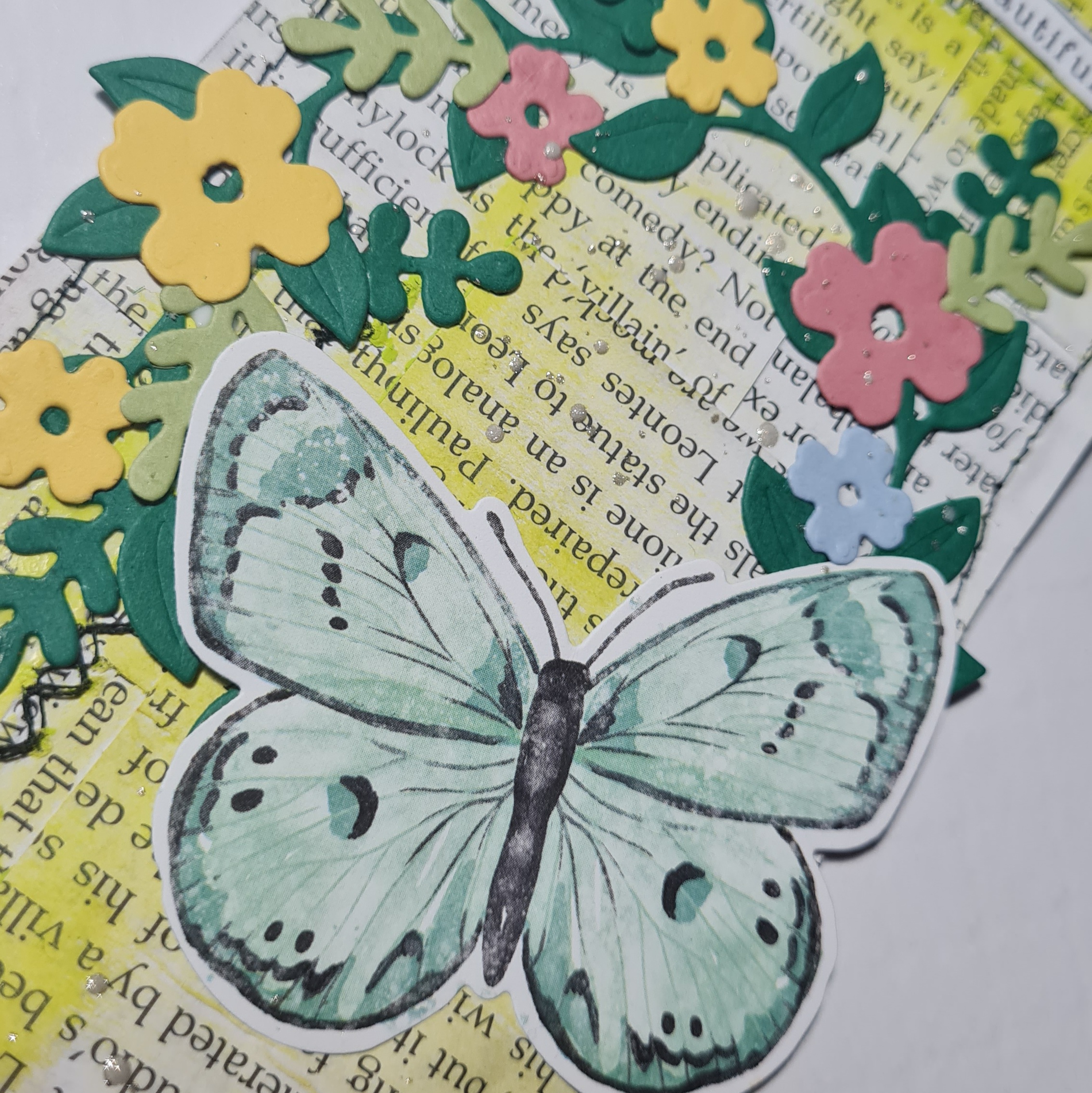 Next I die cut three wreaths and flowers and some additional leaves from scraps of cardstock, and three butterflies from the Butterfly Bijou dsp.