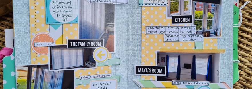 This was a fun layout to make in my 2021 journal using wallpaper samples and some bits from Lollipop box club kits to document new blinds for 3 different rooms!