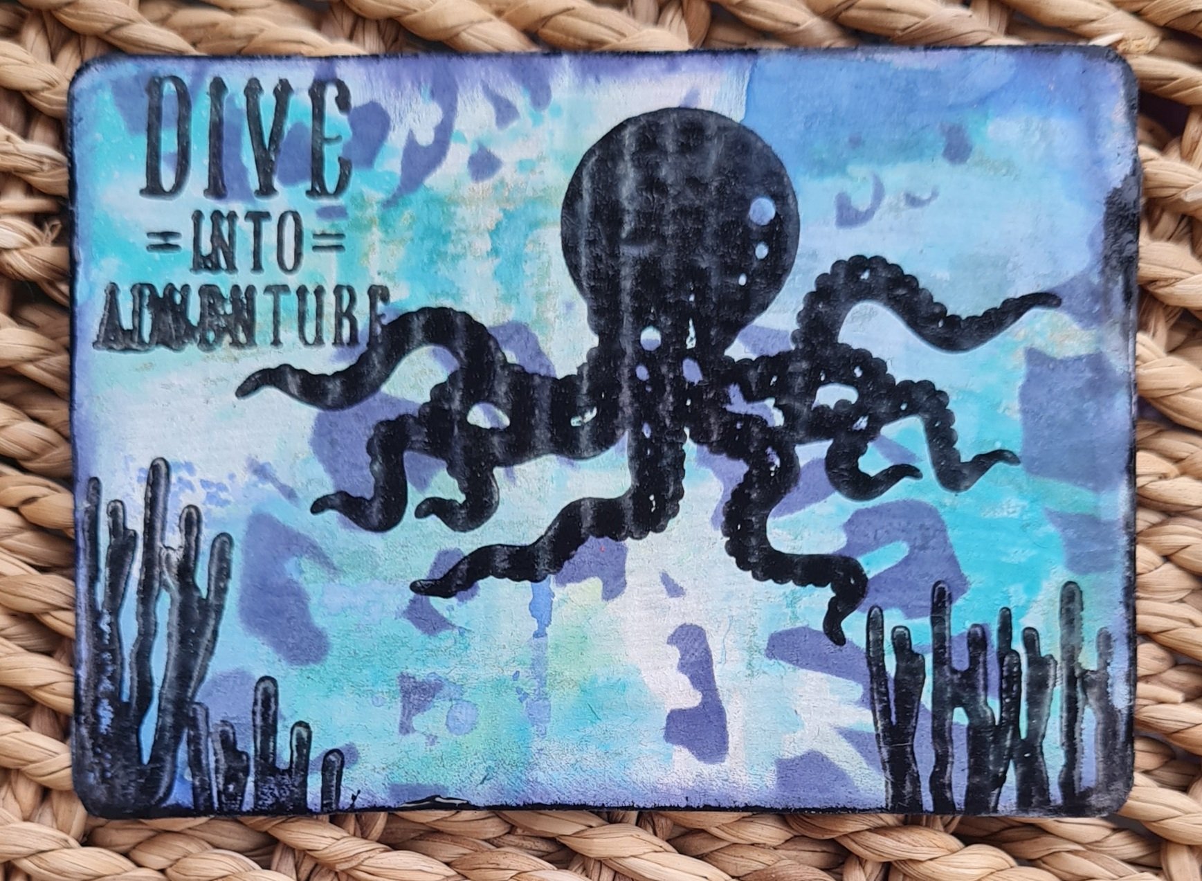 Both ATCs were cut from packaging and then gessoed and Distress Oxide for the background. I stencilled onto the background and then did heavy black stamping for the silhouettes using the stamp platform so I could ensure coverage.