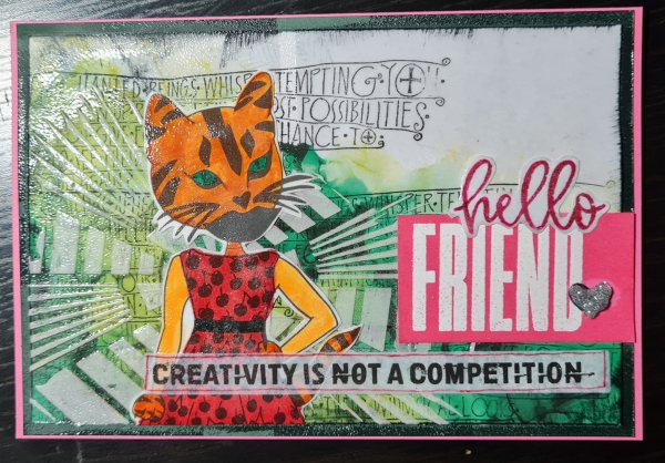 I used some Expressions in Ink dsp as the background and added some stamping to it with some random stamps in my stash. Then I stencilled with texture paste. I also added the die cut which I coloured in and some embossing and some stamped sentiments and a sticker.. basically just played and thre things at the postcard until I was happy with the result!