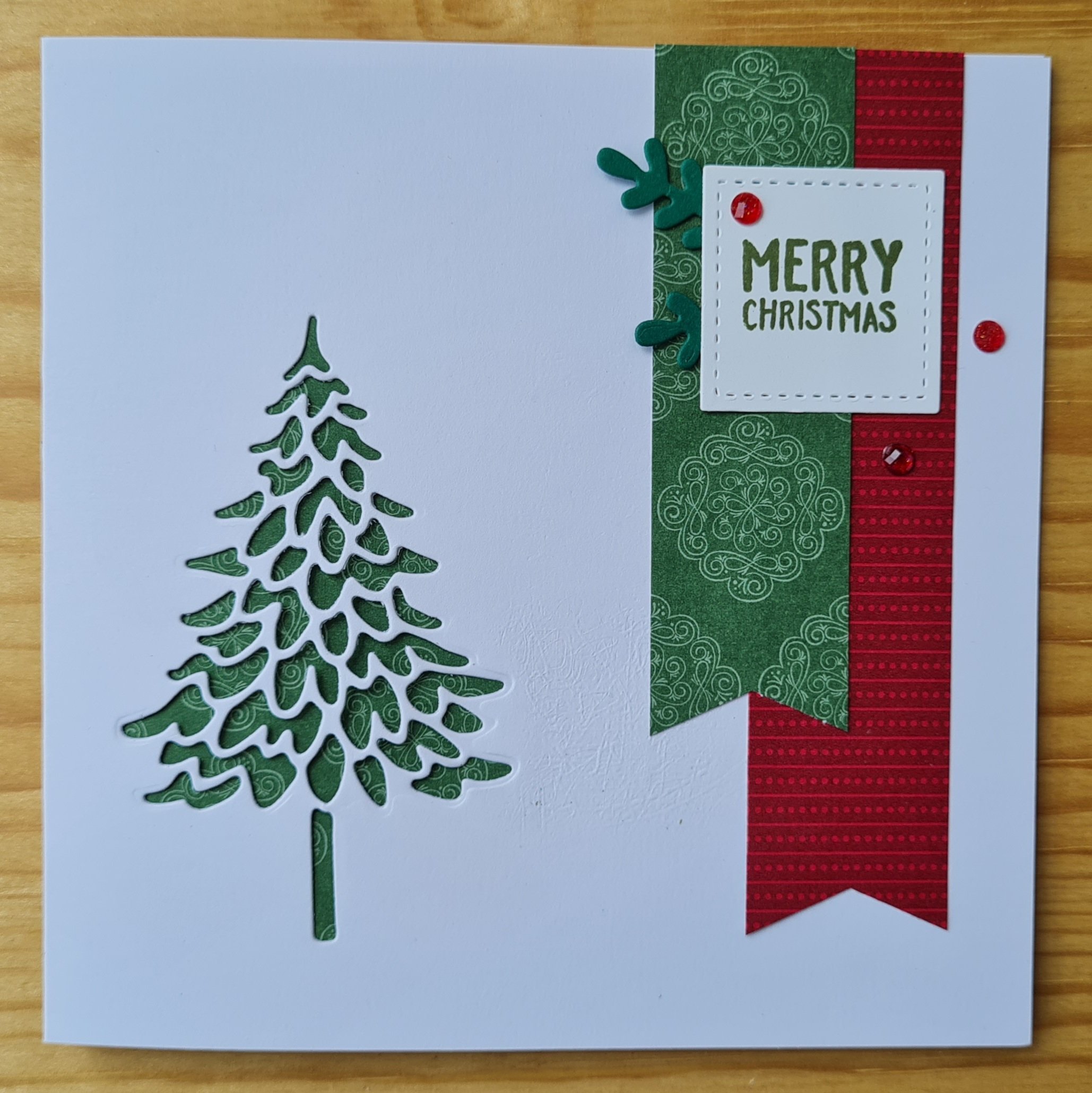 Last year the In the Pines bundle included this fab die that cuts the inside sections of the tree and didn’t really use it much. I decided to cut the card blank with the die and put the dsp behind onto the inside of the card.