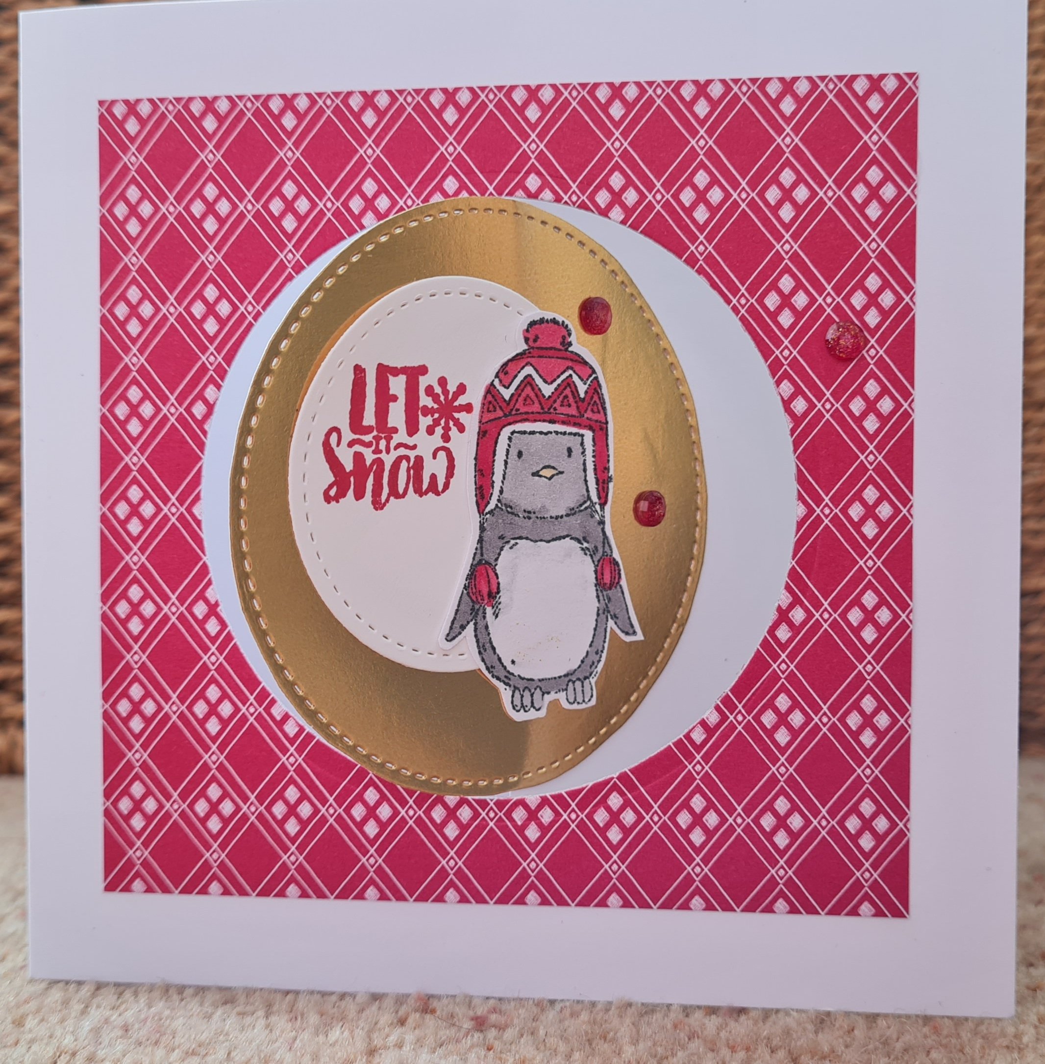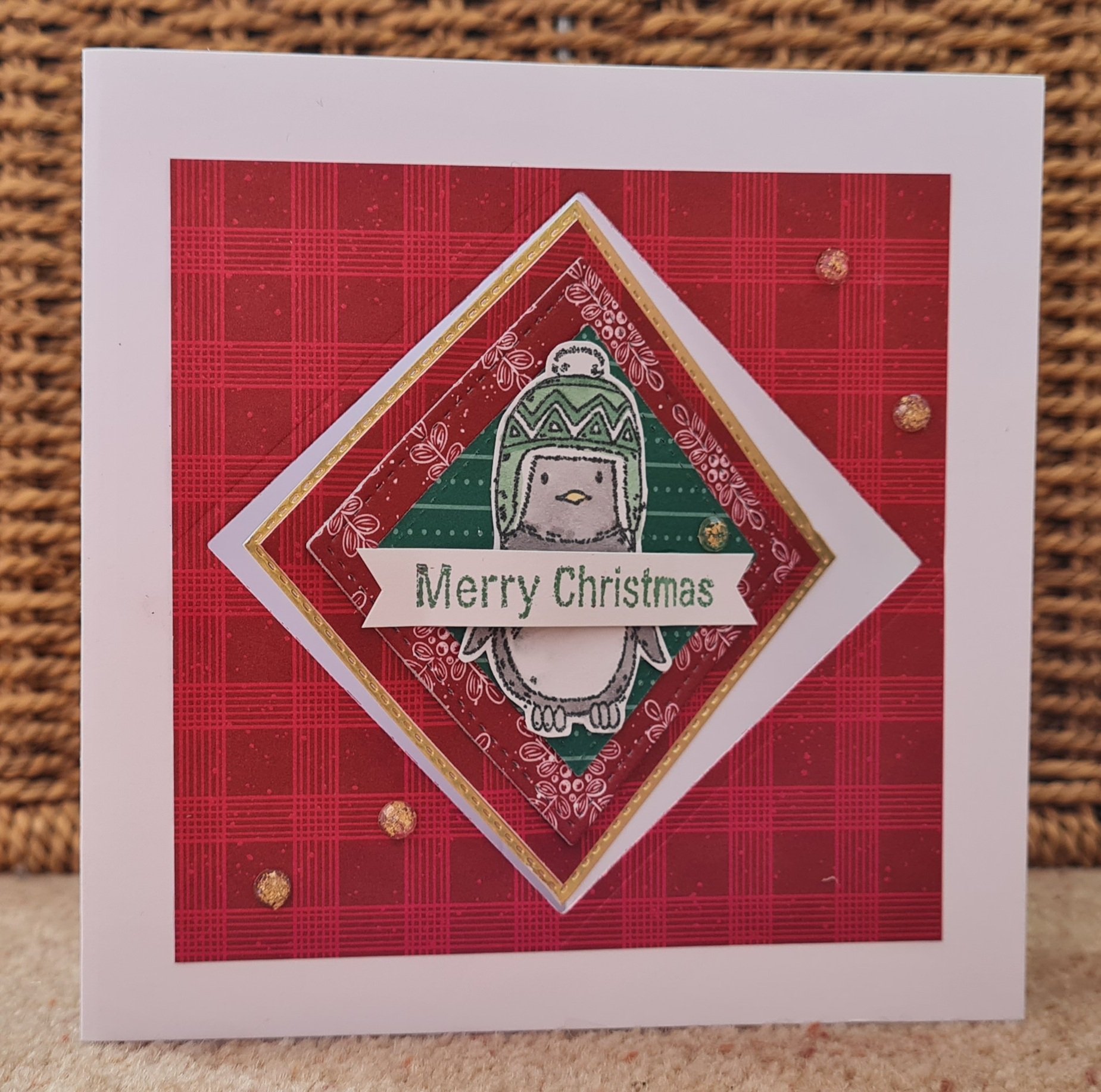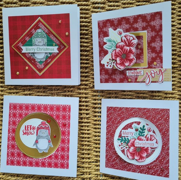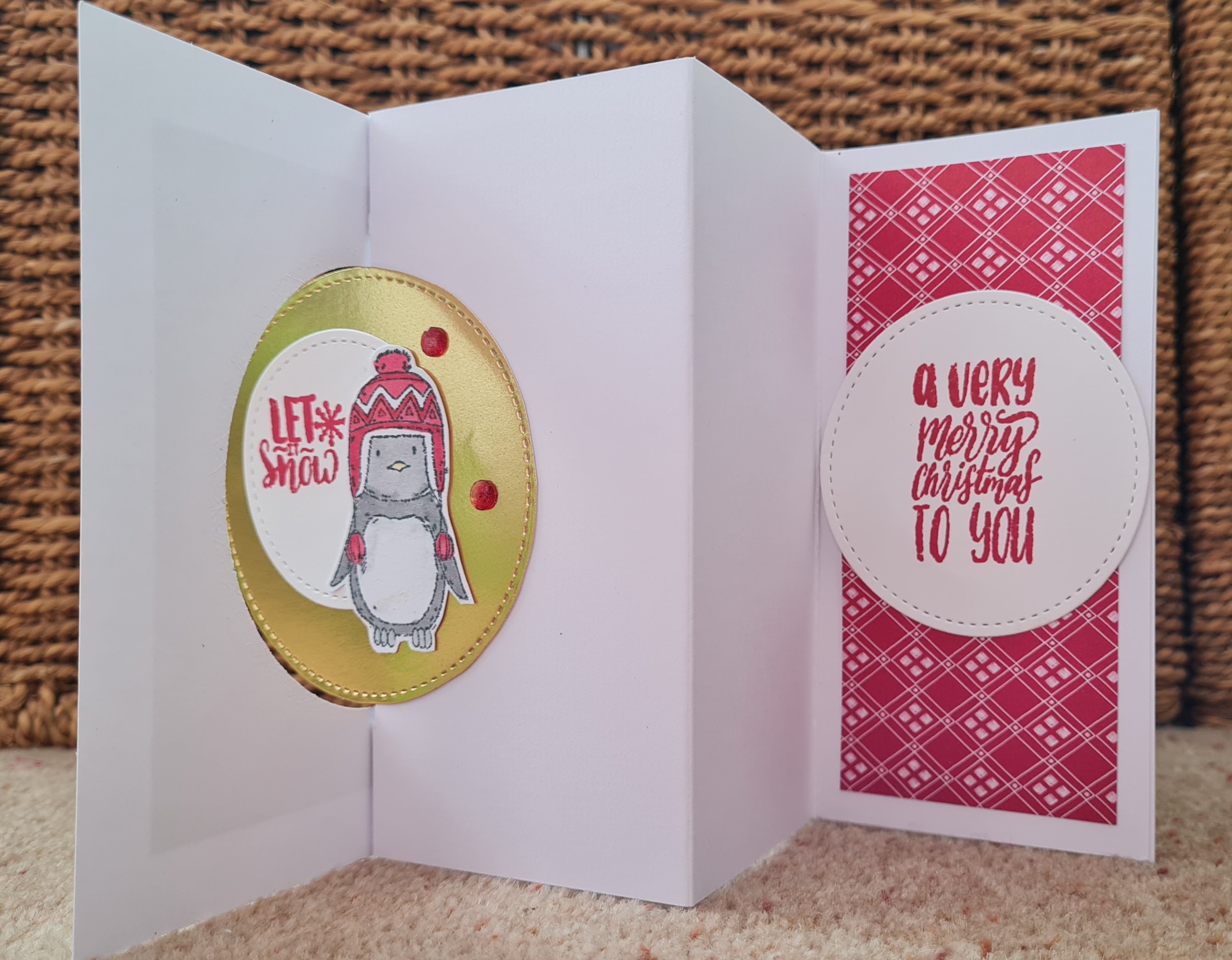 I decided to use the red sides of the papers mainly and then used some leftover bits and pieces from the Paper Pumpkin Joy to the world kit and some cute penguins from an old card making magazine.