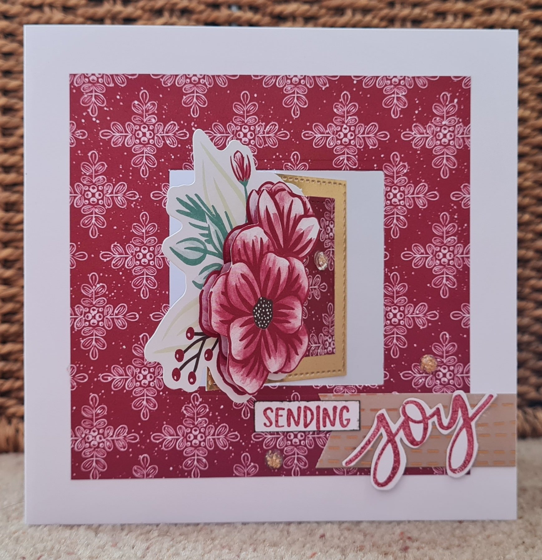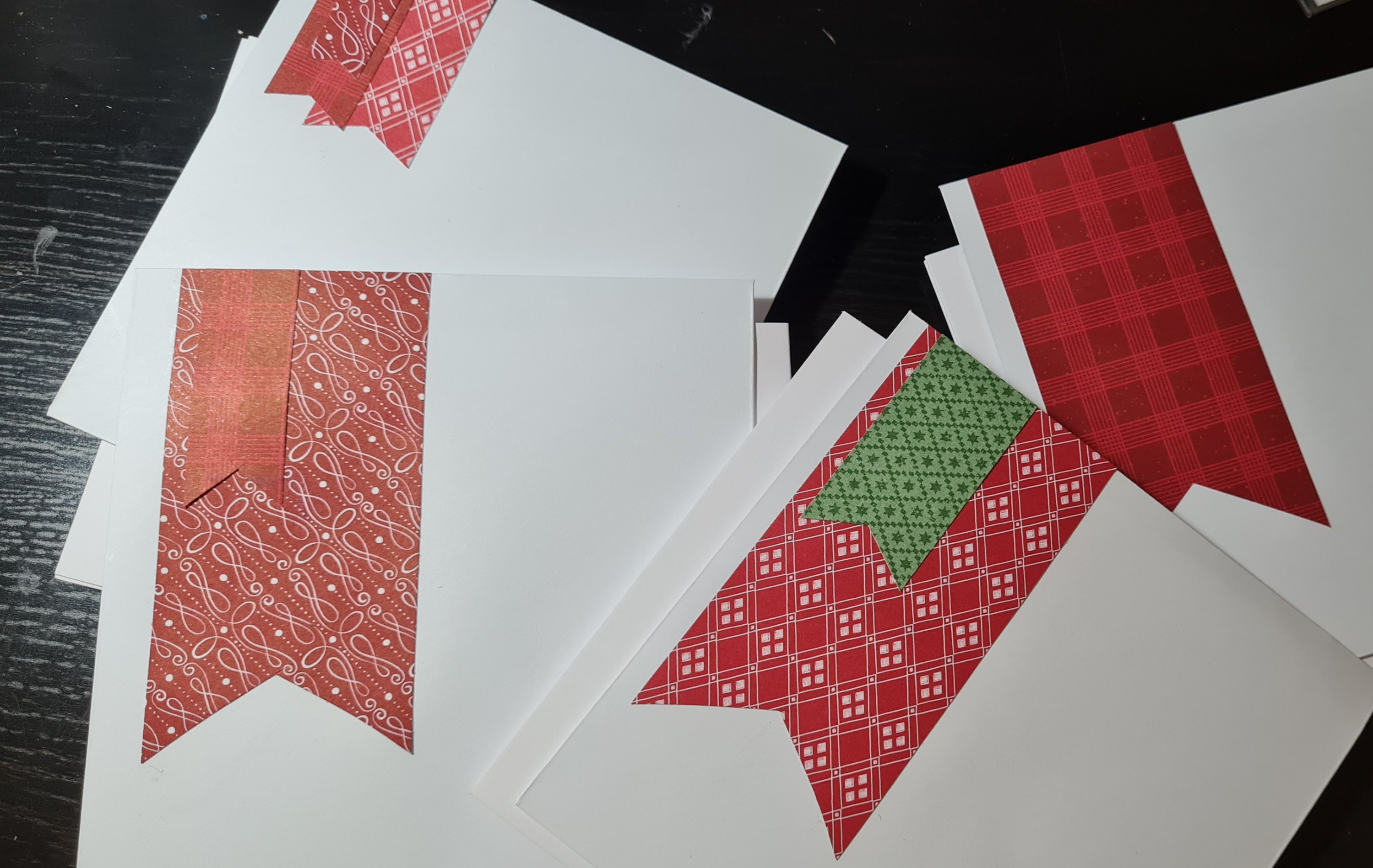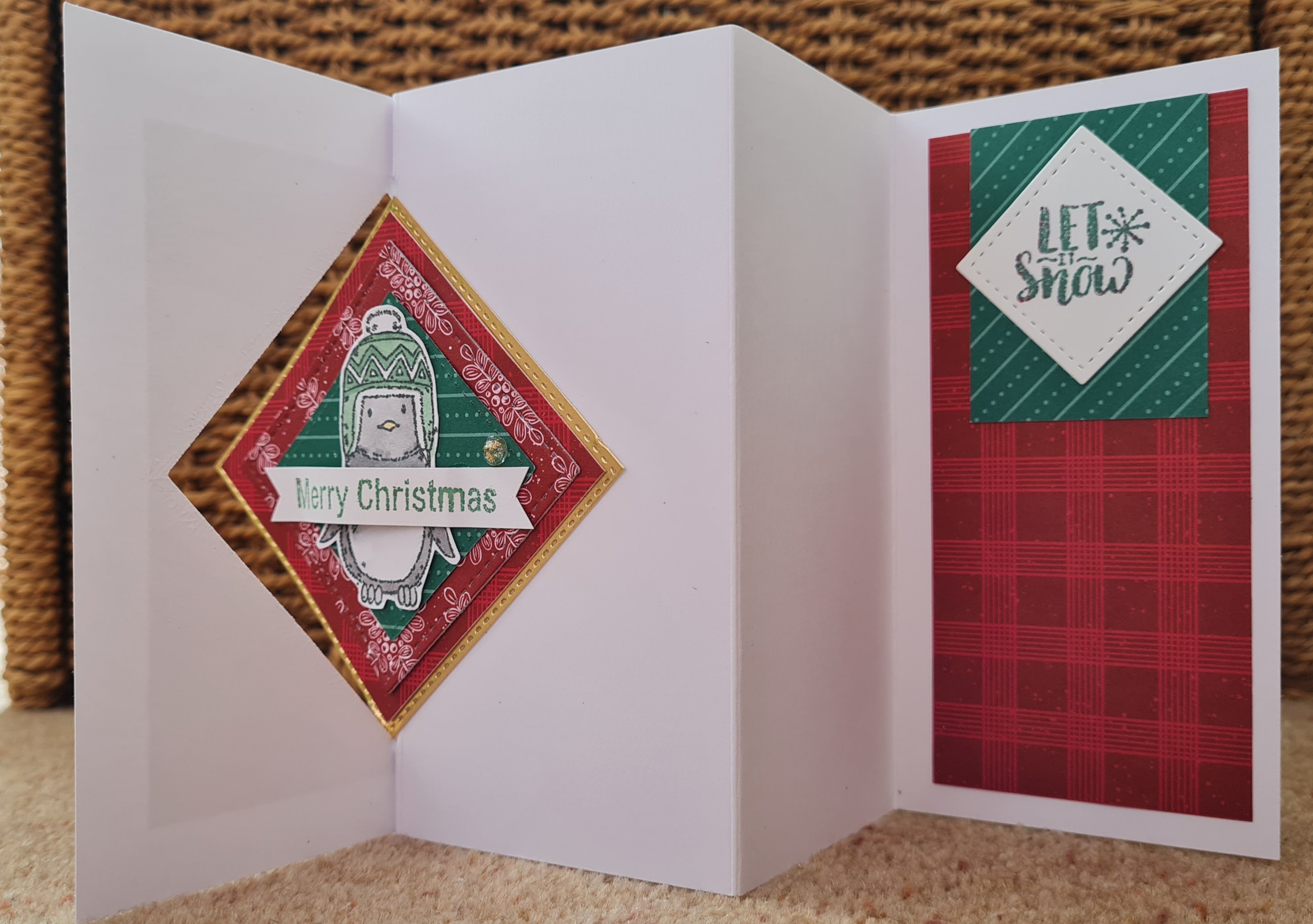 I decided to use the red sides of the papers mainly and then used some leftover bits and pieces from the Paper Pumpkin Joy to the world kit and some cute penguins from an old card making magazine.