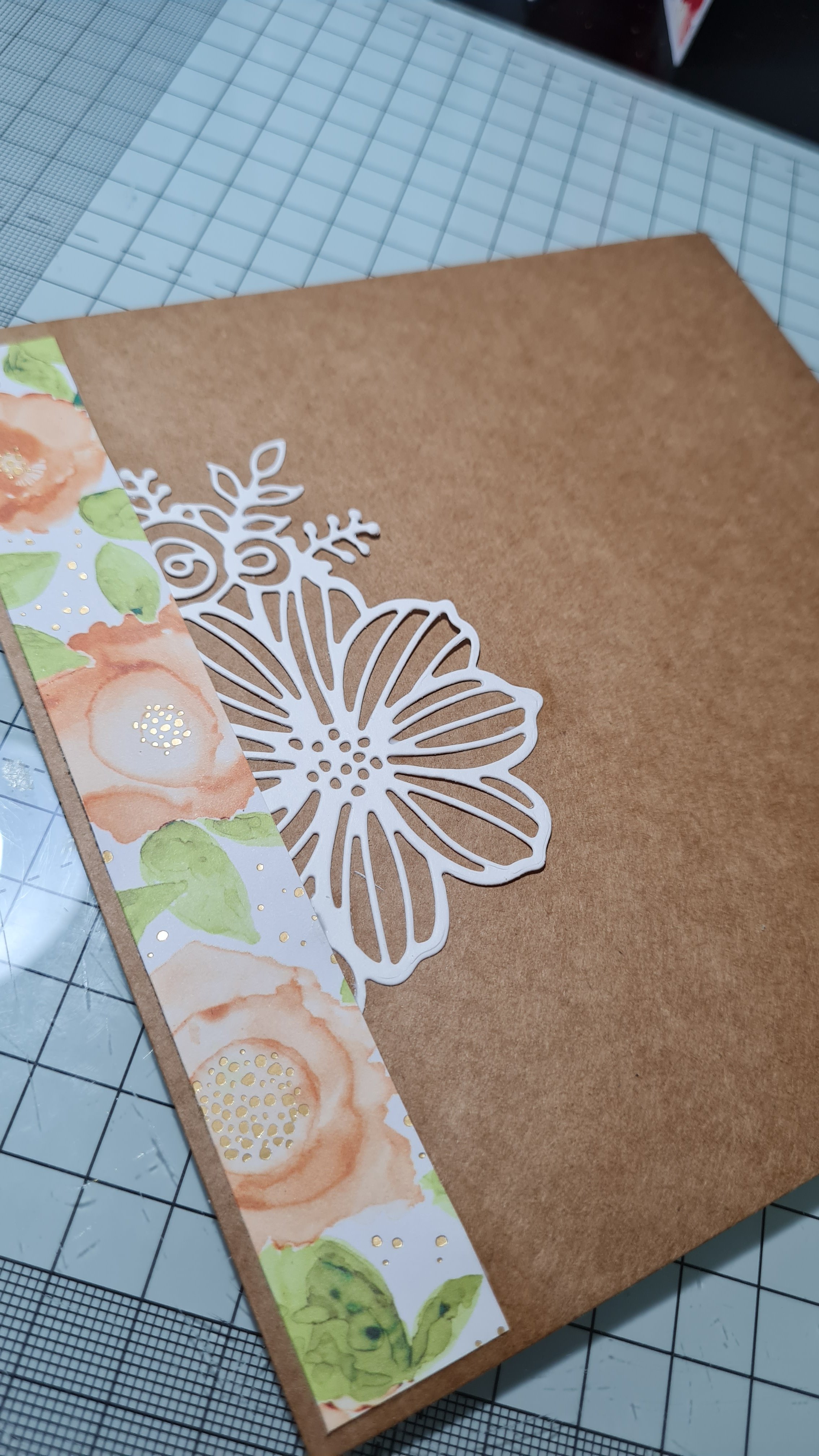 I also die cut the leaves from the piece of kraft I had cut out for the mechanism and from white I cut the floral piece.