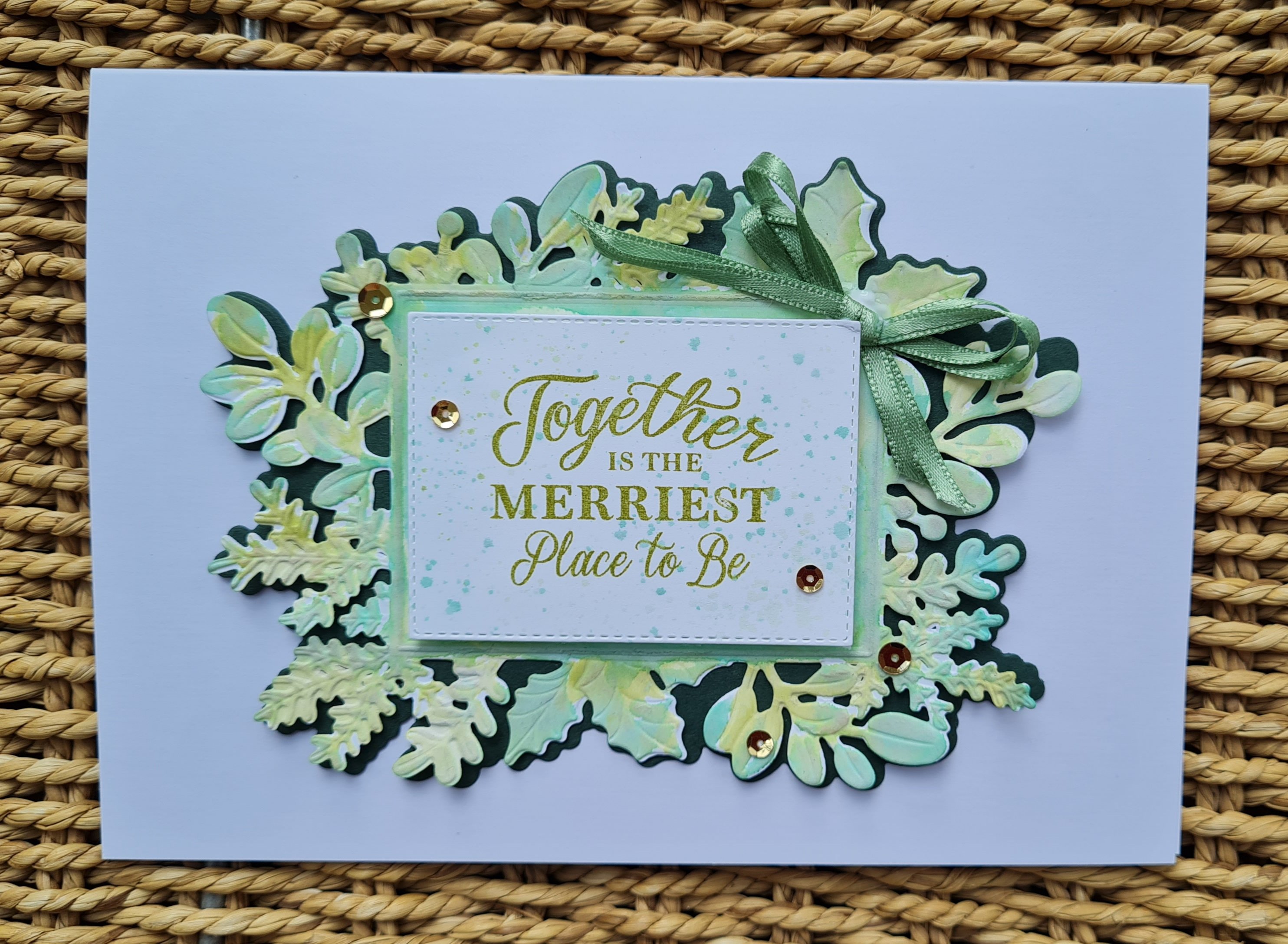 I die cut the panel using Evening evergreen to add a lovely base and frame to the panel. The finishing touches for this were some sequins and the pretty green ribbon.