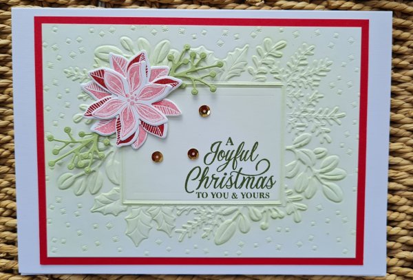 Firstly I’ve got the plain embossing folder run through where I added colour using the blending tool and then added the sentiment and some of the flowers. I also added in sone die cut sprigs from the Christmas Tidings dies too.