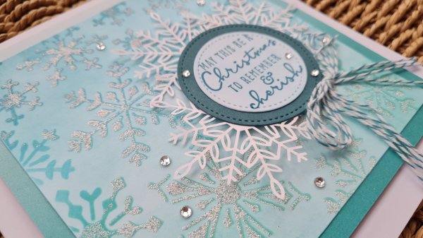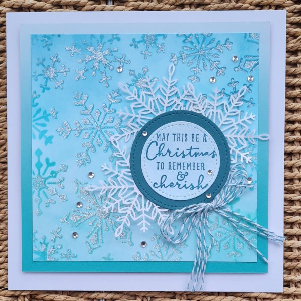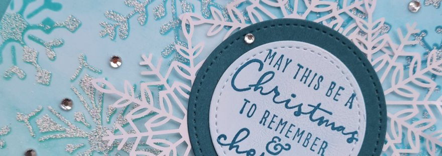 I started with the snowflake stencil and blue inks and the blending tools and created a blended background and snowflake images. Once I had got all the ink down I then added versamark through the stencil and used a sparkly embossing powder to add some glitz to the snowflakes.