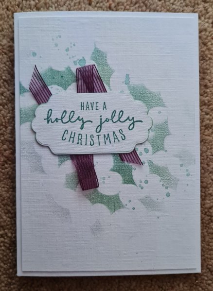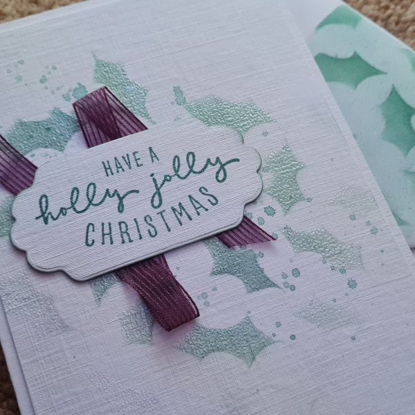 OK so my first card I went with a layer of simple stencilling (although I did add some embossing to give it a pearlescent shine) and some splatters, and then a simple stamped and die cut sentiment with a twist of ribbon sandwiched underneath.