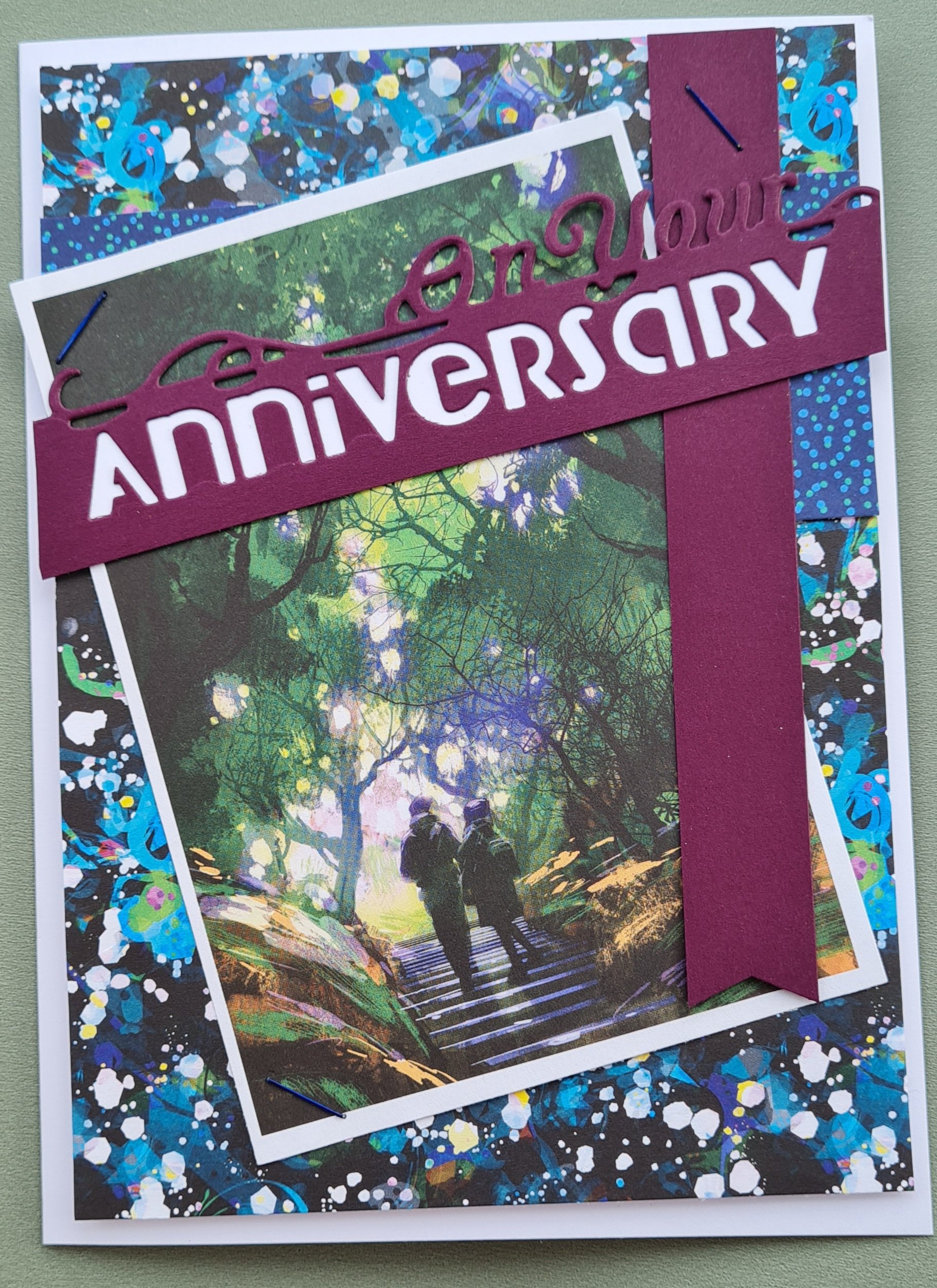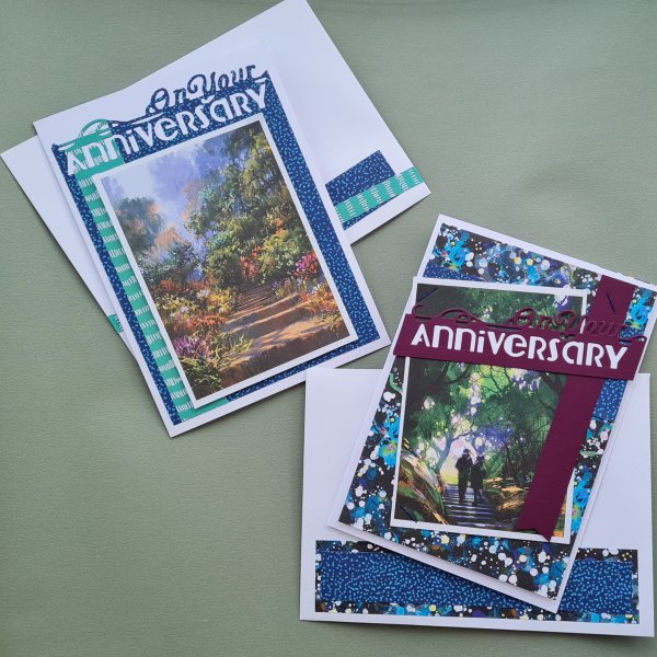 I decided the images lent themselves to be anniversary cards and so decided the Crafters Companion anniversary die would do the heavy lifting on this and kept the rest of the cards fairly simple with layered papers and a bit of cardstock.