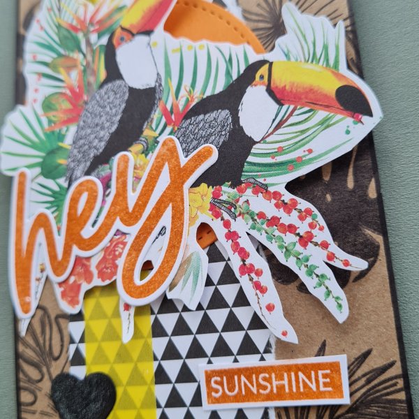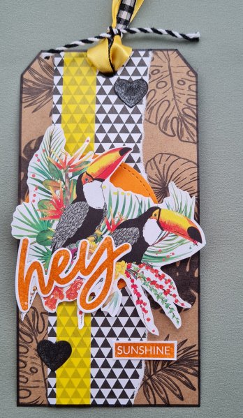 So the rule is that there has to be stamping so I decided to create my own background for the tag using stamps from an old Creative Stamping magazine. The different tropical leaves work so well with the toucan image. I then added some of the remaining paper as a strip along with a piece of yellow washi that I thought added some additional colour and brightness as I had chosen a craft tag for the base.