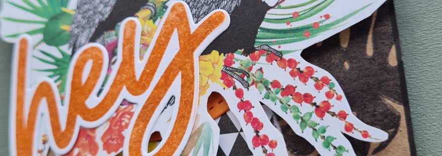 So the rule is that there has to be stamping so I decided to create my own background for the tag using stamps from an old Creative Stamping magazine. The different tropical leaves work so well with the toucan image. I then added some of the remaining paper as a strip along with a piece of yellow washi that I thought added some additional colour and brightness as I had chosen a craft tag for the base.