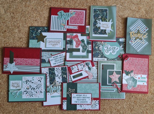 I make the cards in stages…. cutting, then putting the pieces into labelled envelopes, next the layers of cardstock are cut and added to the envelopes. Then I stamp and cut lots of embellishment pieces so I have a little pile to use. Then I start to assemble but not always finish the card topper (I make these as card toppers first before I add to card blanks/make card blanks). Sometimes I just add layers to the paper pieces and add a few bits into the envelope and come back as I know I want an additional element like a ribbon, or sometimes it comes together immediately with everything to hand. But at least this way I get to just do them a bit at a time and 14 cards isn’t too overwhelming to deal with!