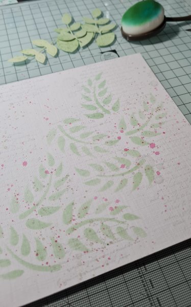 Next I started inking the die cut leaves and flowers to add some depth to the colour. I also added some stamped splatters to the green.