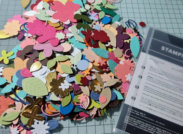 Now the card came together after I had sat and turned lots of scraps of cardstock into pretty flowers and leaves. I do this quite often, save my scraps up and then have a massive die cutting session. This time I concentrated on the Pierced Blooms die set as these flowers and leaves always come in handy as embellishments. I ended up (after 2+ hours diecutting) with a big pile and a sore arm!