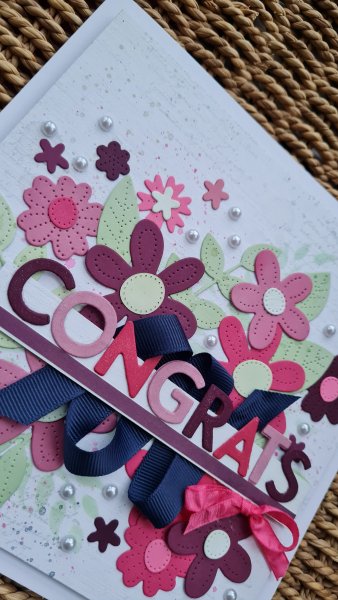 The sentiment I went for the Playful Alphabets dies and die cut CONGRATS out twice from each colour. I stacked the dies and then using a ruler to line them up I added them so they were off the edge of the strip of cardstock I had prepared. I also added a very thin strip of Oh So Ombre paper to the panel. I stacked a few layers of cardstock behind the panel to lift it up and then added the navy ribbon behind it to frame the sentiment. I added wink of Stella to each of the letters to give them some shimmer.