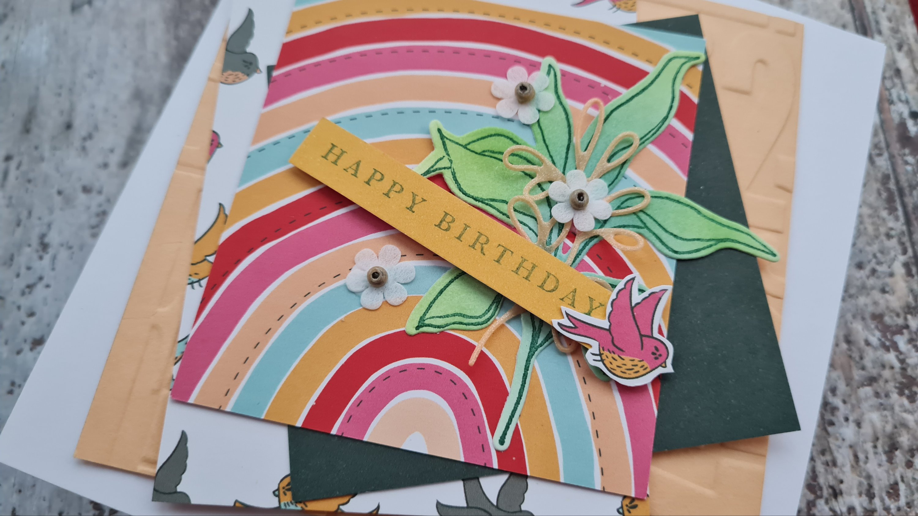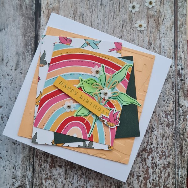 I stamped the sentiment onto a strip cut off another one of the cards and cut a little bird out of the middle of the card I had put at the back as the accent embellishment.