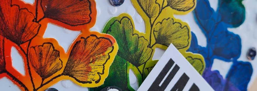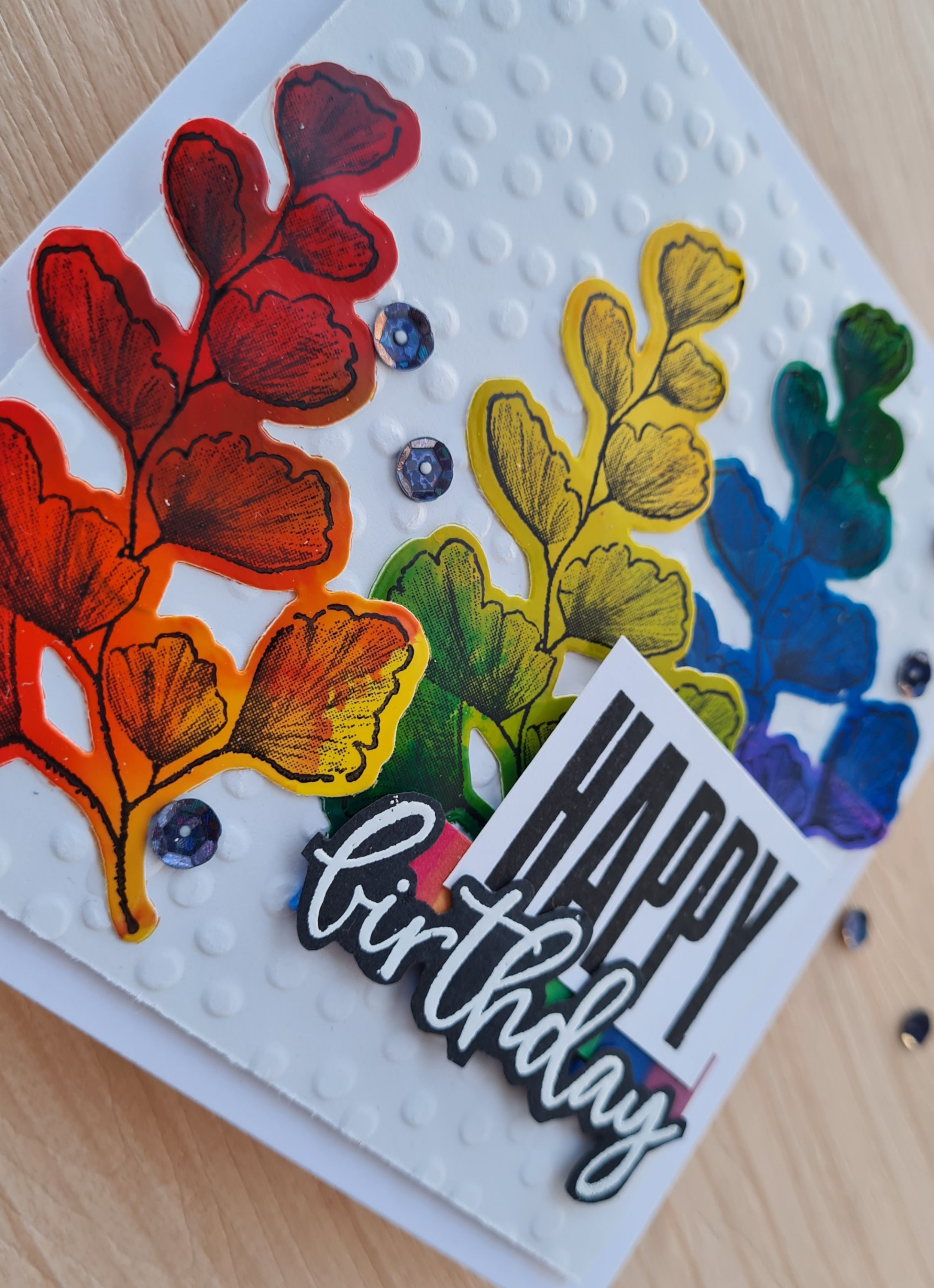I decided to use the lovely Nature’s Prints stamp and used some glossy photo paper to create a fun alcohol ink background to stamp onto. I must admit my alcohol ink background didn’t blend as well as I would have liked but when die cut and stamped it looked fabulous.