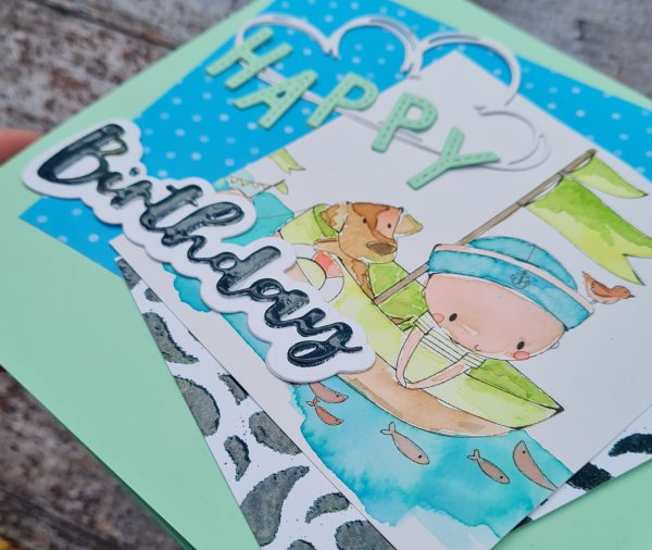 I did add a panel of dsp in the Tahitian Tide too and put all those elements on a pale green card blank. The cardblank was A4 size but I trimmed it down to 6×6 and then used an offcut to die cut the Happy letters. I did think it needed something else whilst I was putting it together so die cut the cloud from Gummipan as a final element.