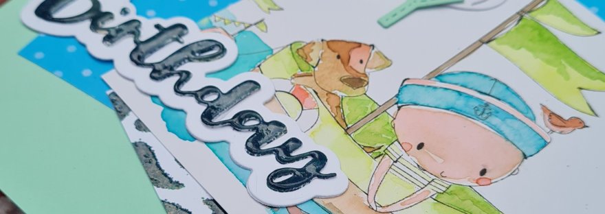 I did add a panel of dsp in the Tahitian Tide too and put all those elements on a pale green card blank. The cardblank was A4 size but I trimmed it down to 6×6 and then used an offcut to die cut the Happy letters. I did think it needed something else whilst I was putting it together so die cut the cloud from Gummipan as a final element.