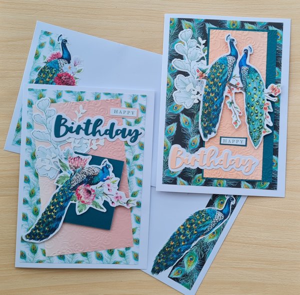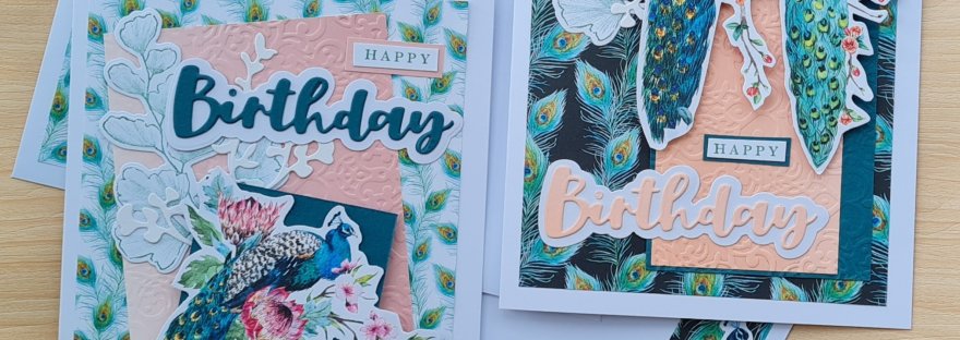 Both cards have a slightly different colour scheme … one pink, one peach. But both very similar with the Pretty Peacock as the other colour cardstock. I then decided to use the Time for Tea birthday sentiment die along with the Happy from Cottage Rose stamps.