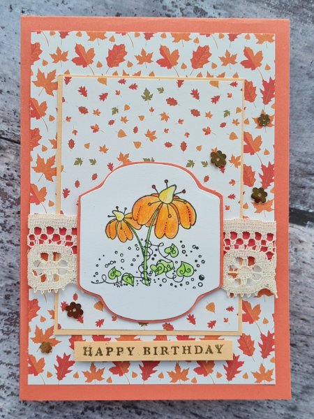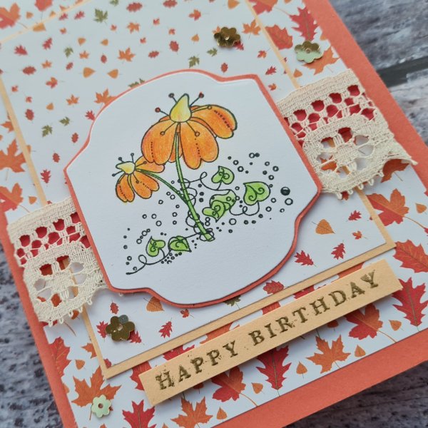 I thought these autumnal papers worked perfectly along with the peach/ coral coloured cardstock. I hand cut a mat for the image and also added the lace trim as something to soften the look.